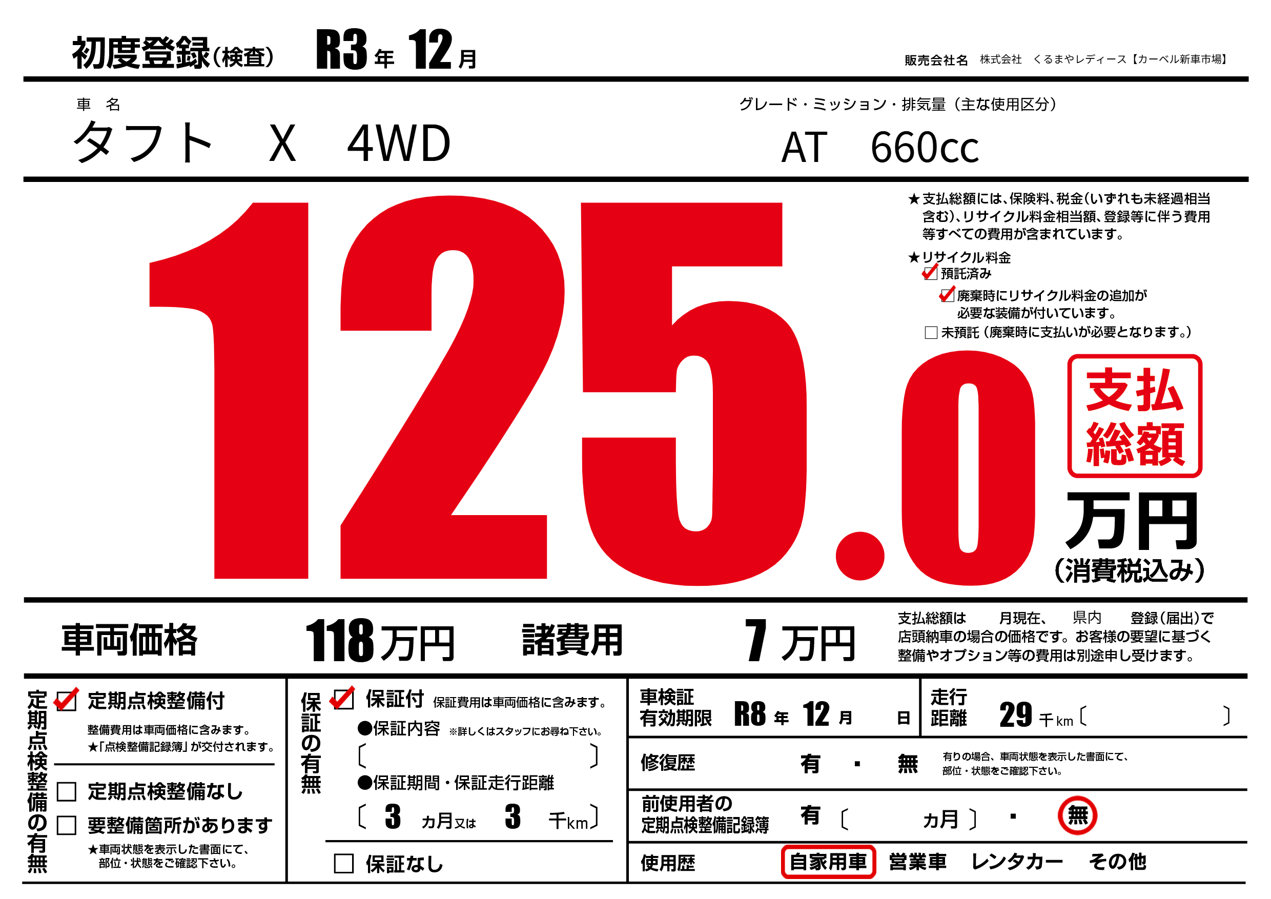 | 車名 | タフト X 4WD | グレード ミッション 排気量 |