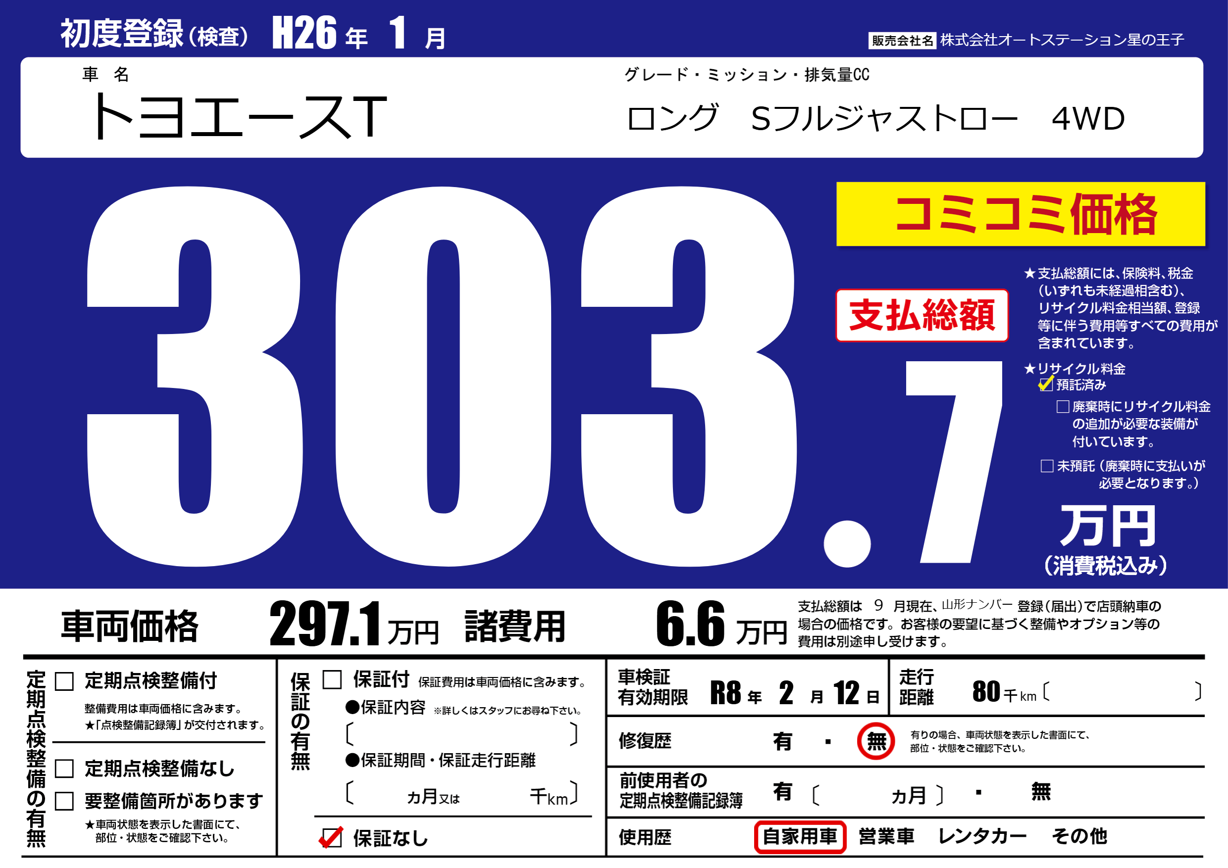 | 走行キロ | 8万km | 初年度登録 | H26年1月 |