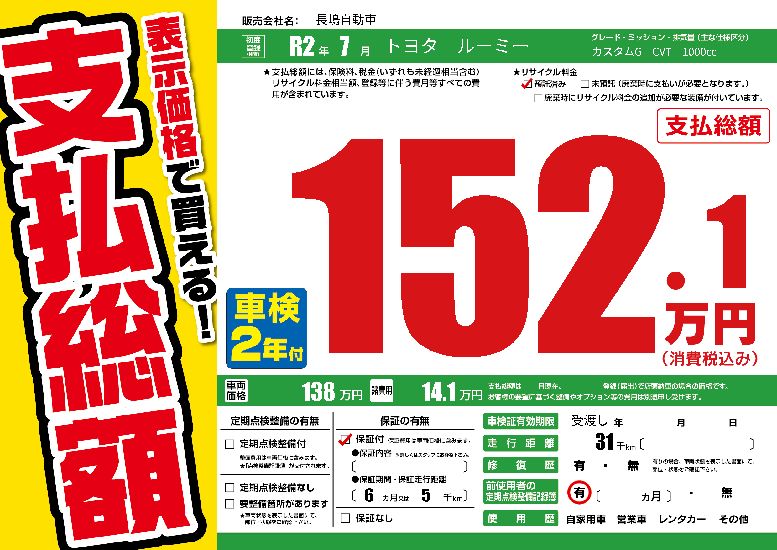 なし | 車検制限 | 受渡し年---月---月 |