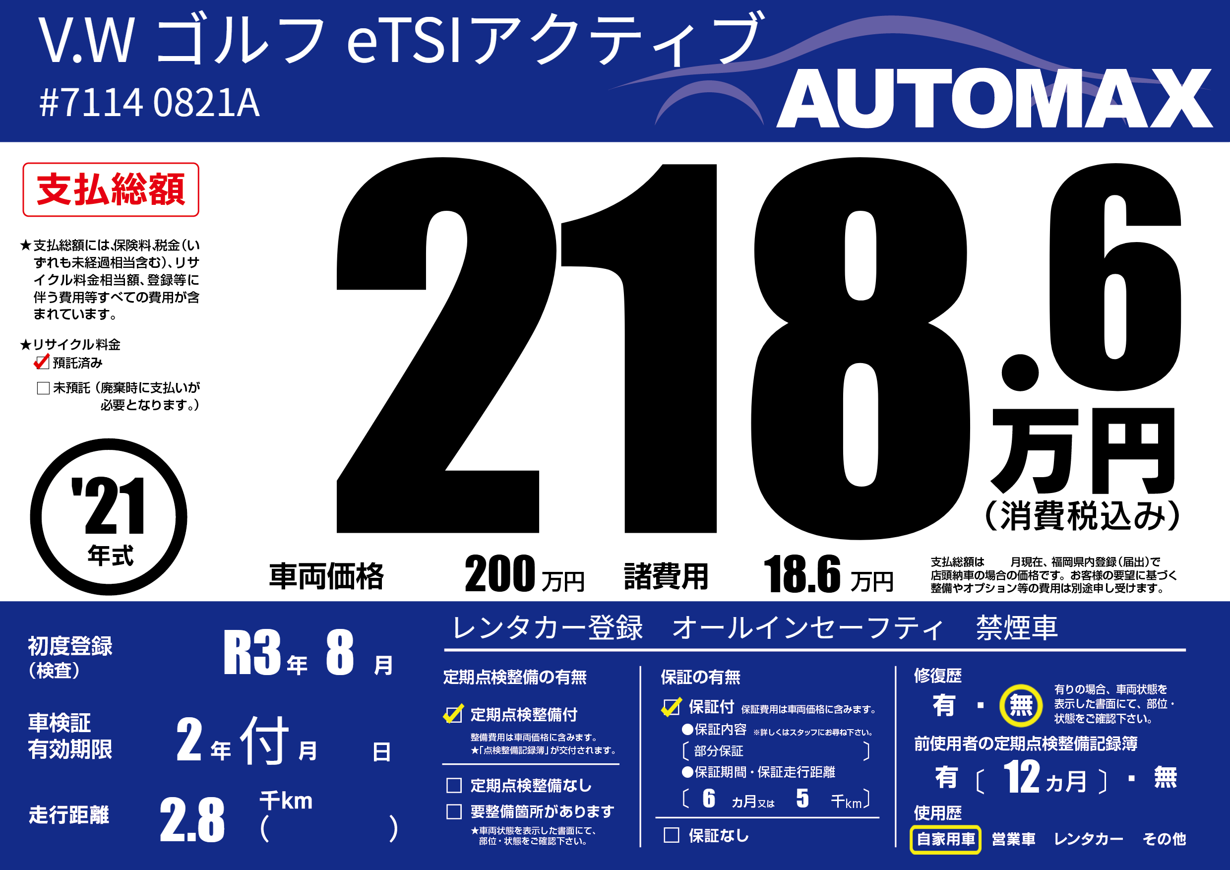 | 車名 | V.W ゴルフ eTSIアクティブ | グレード ミッション 排気量 |