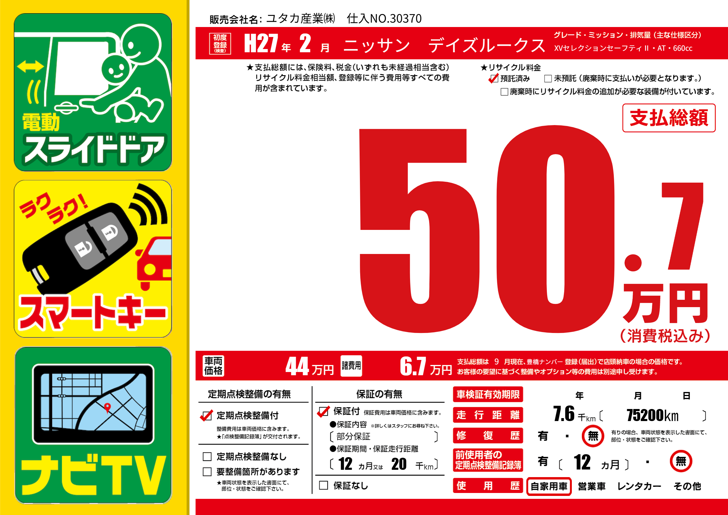 | 車名 | ニッサン デイズルークス | グレード ミッション 排気量 |