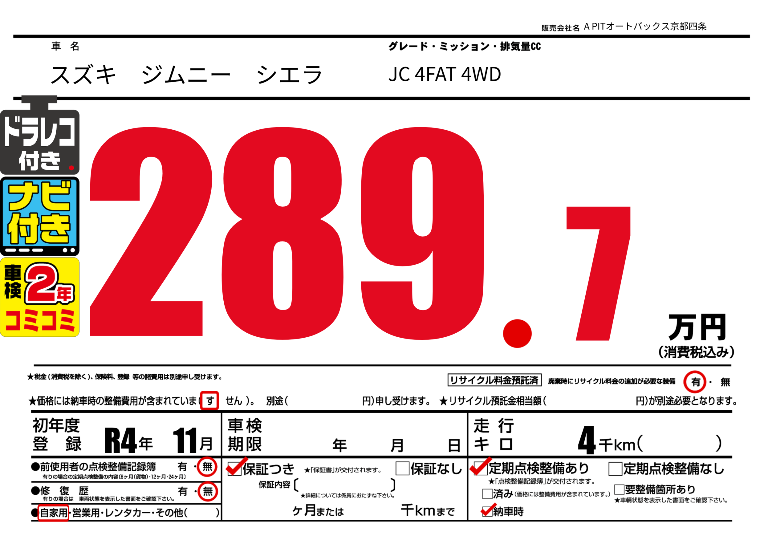 | 走行キロ | 0.4万km | 初年度登録 | R4年11月 |