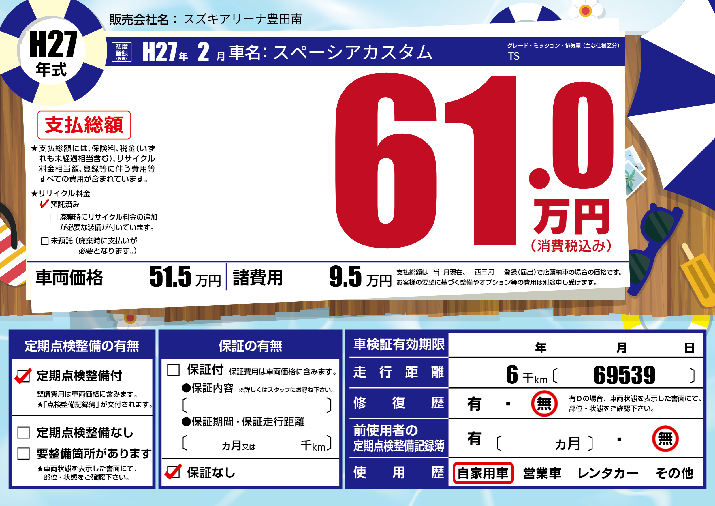 | 車名 | スペーシアカスタム | グレード ミッション 排気量 |