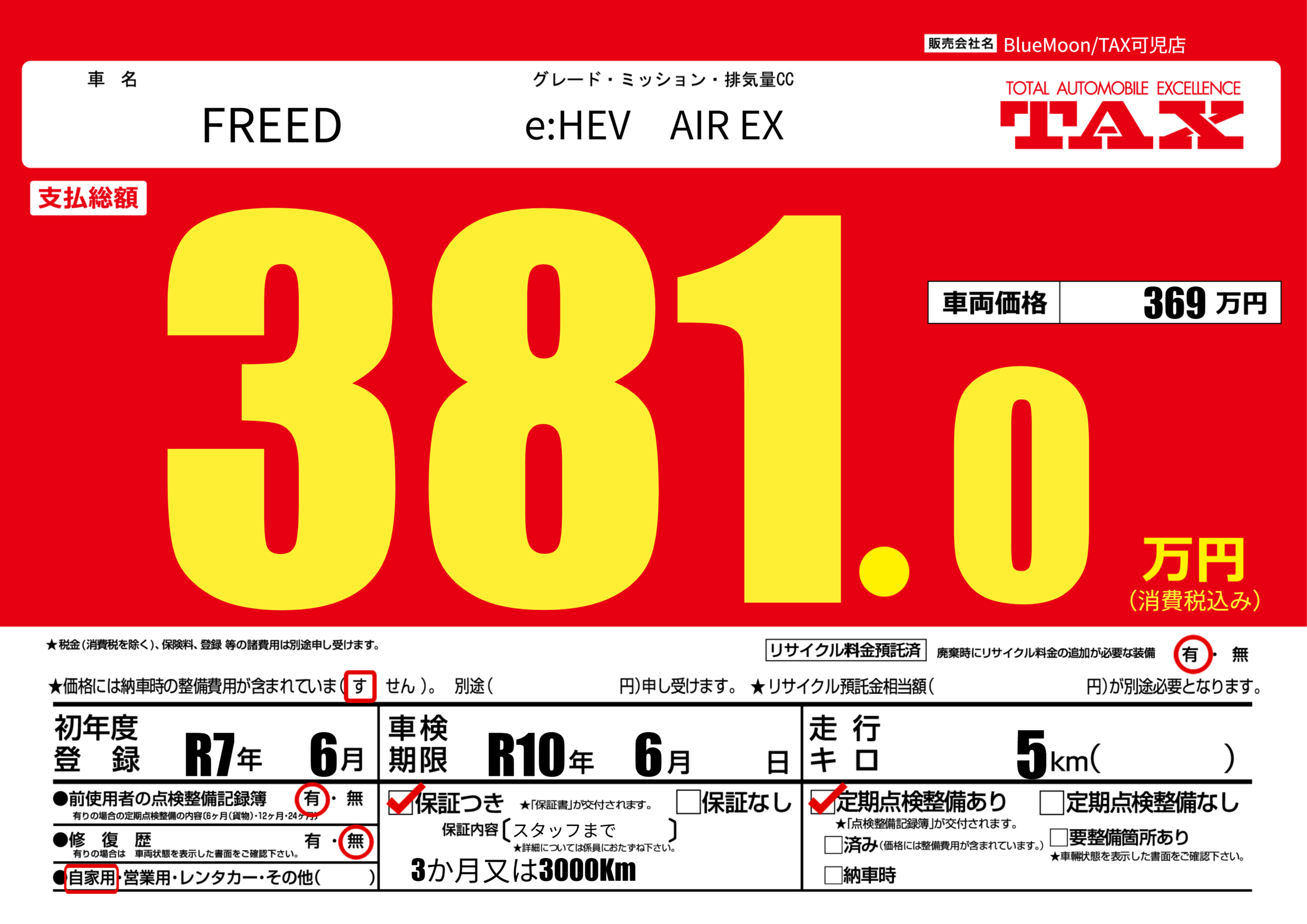 | 走行キロ | 0.5万km | 初年度登録 | R7年6月 |