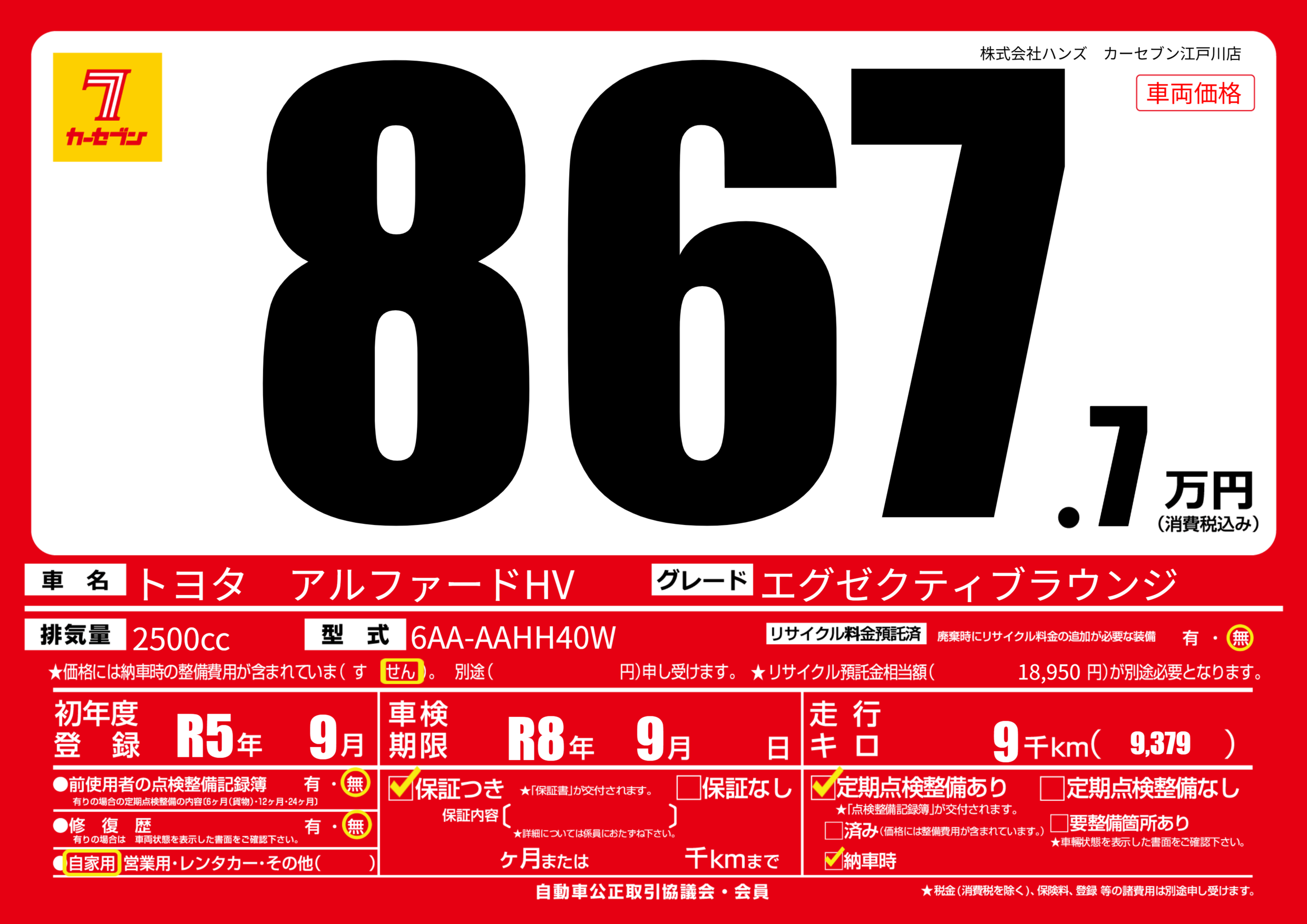 なし | 車検制限 | R8年9月---月 |