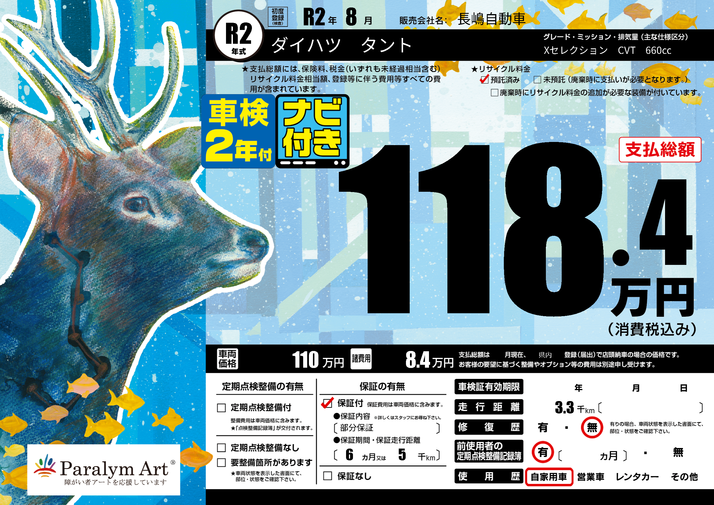 | 走行キロ | 0.3万km | 初年度登録 | R2年8月 |