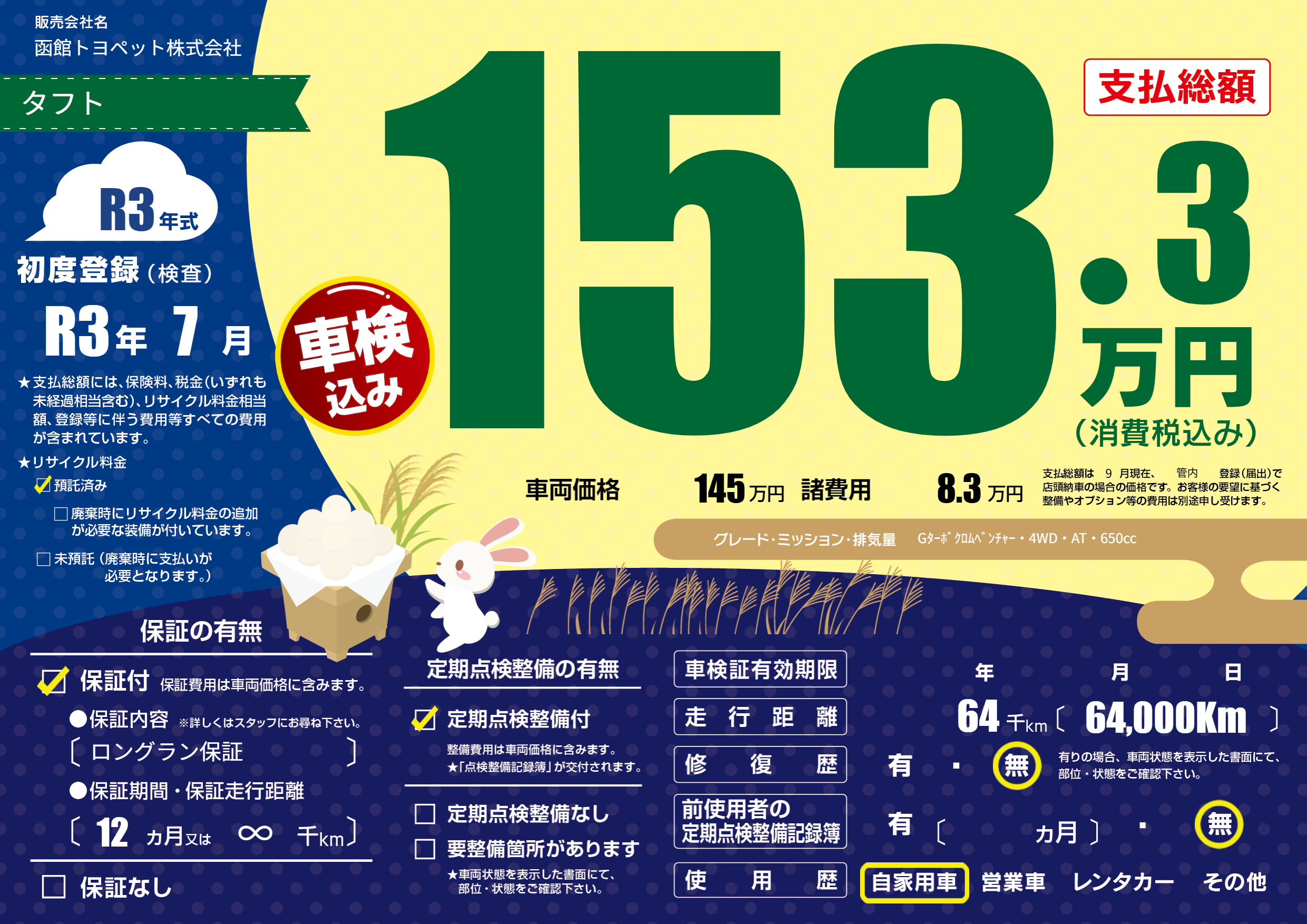 | 走行キロ | 6.4万km | 初年度登録 | R3年7月 |