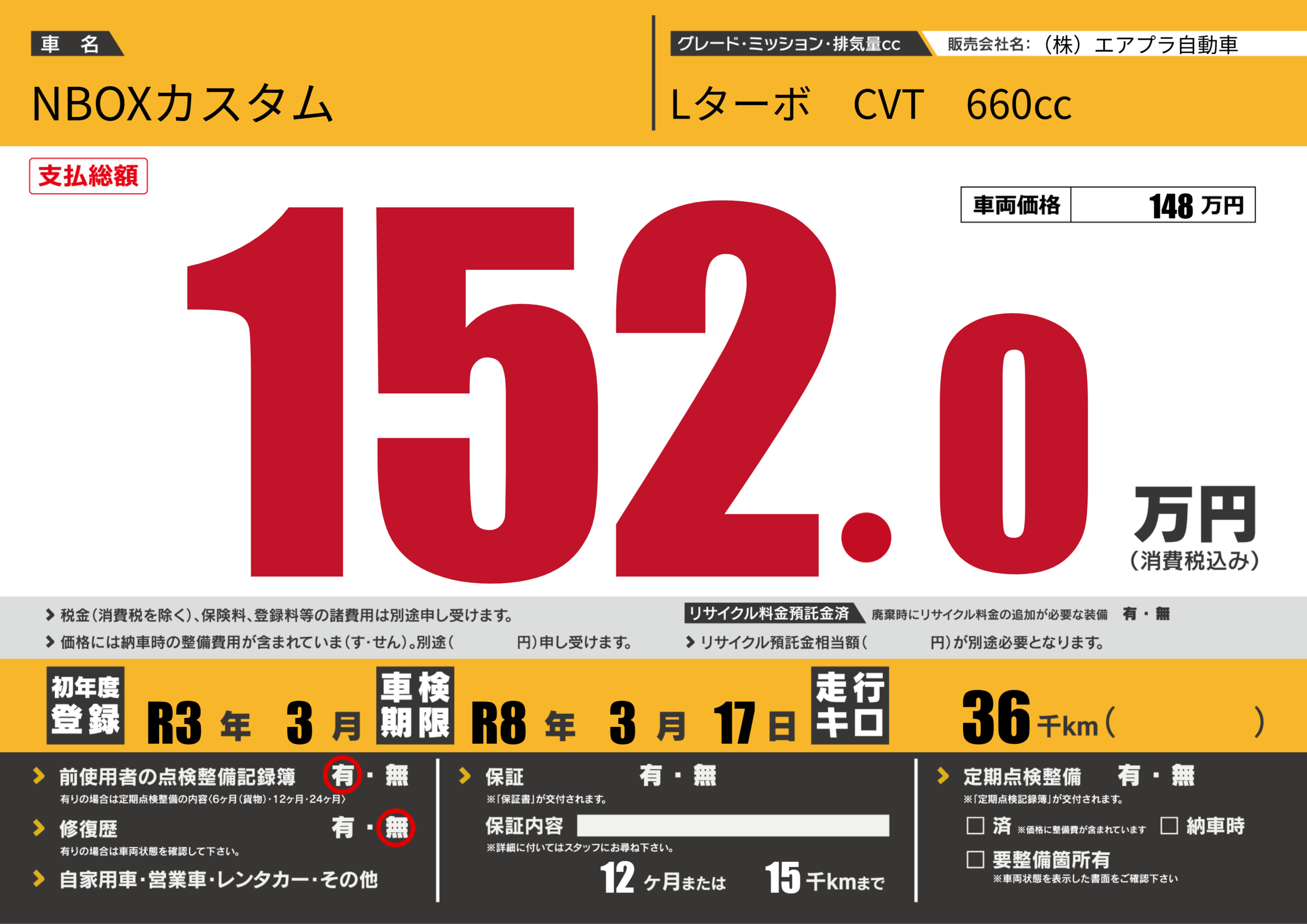 保証なし 保証内容(---) 12ヶ月または(15)千kmまで |