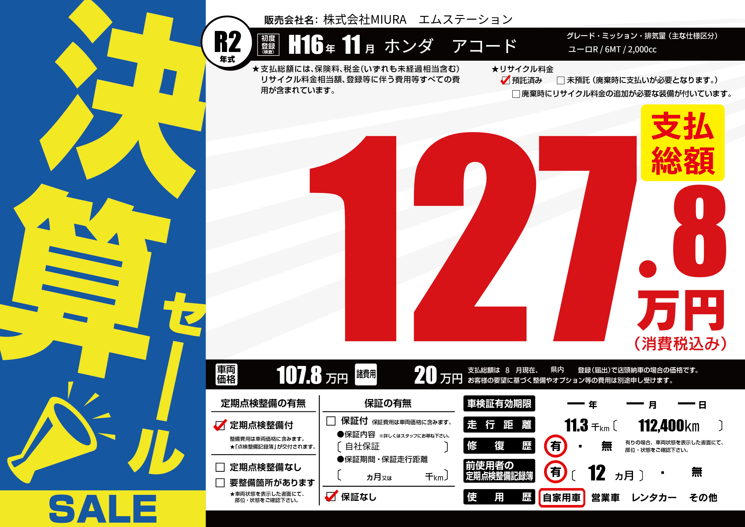 | 車名 | ホンダ アコード | グレード ミッション 排気量 |