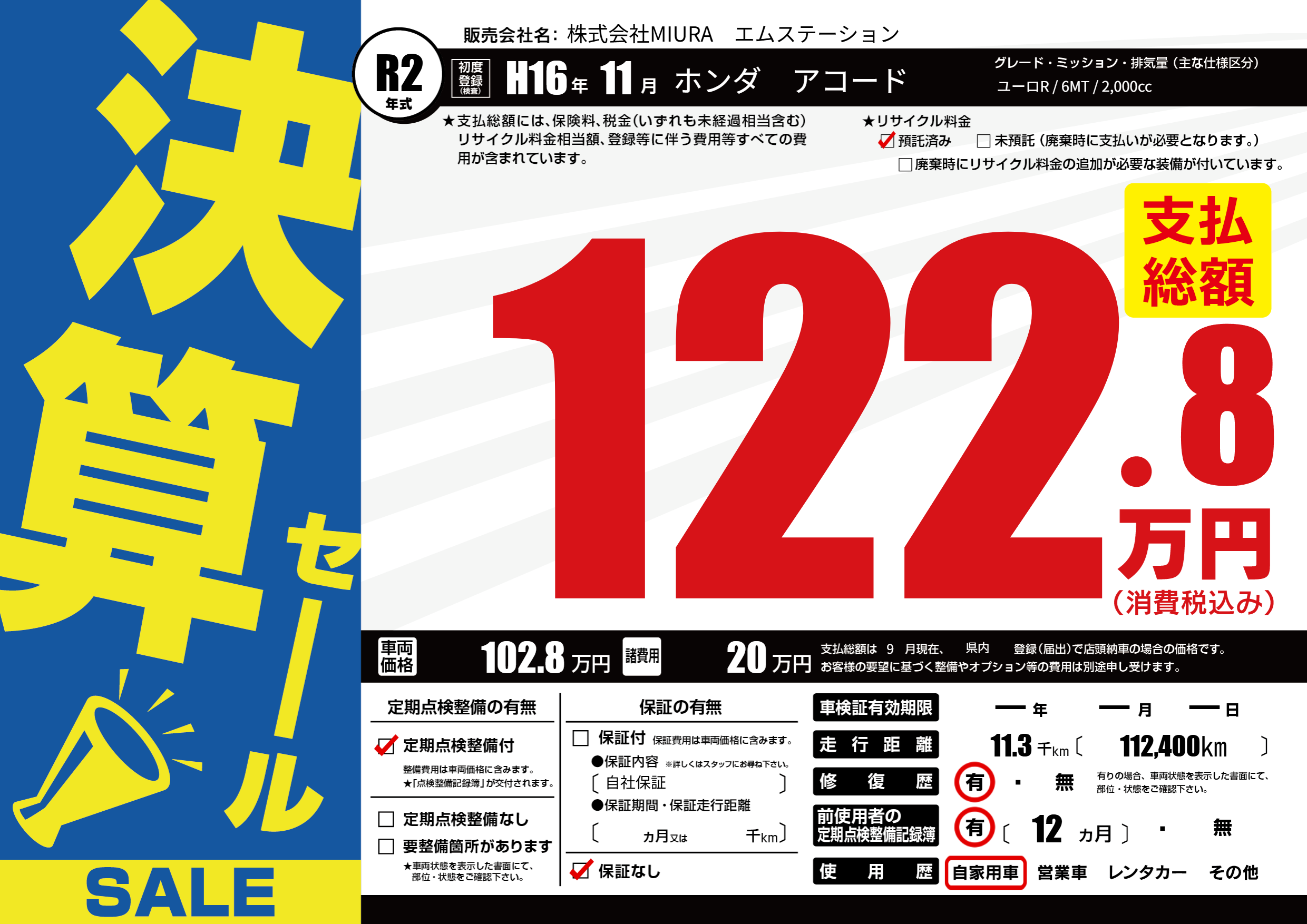 保証なし 保証内容(自社保証) ---ヶ月または()千kmまで |