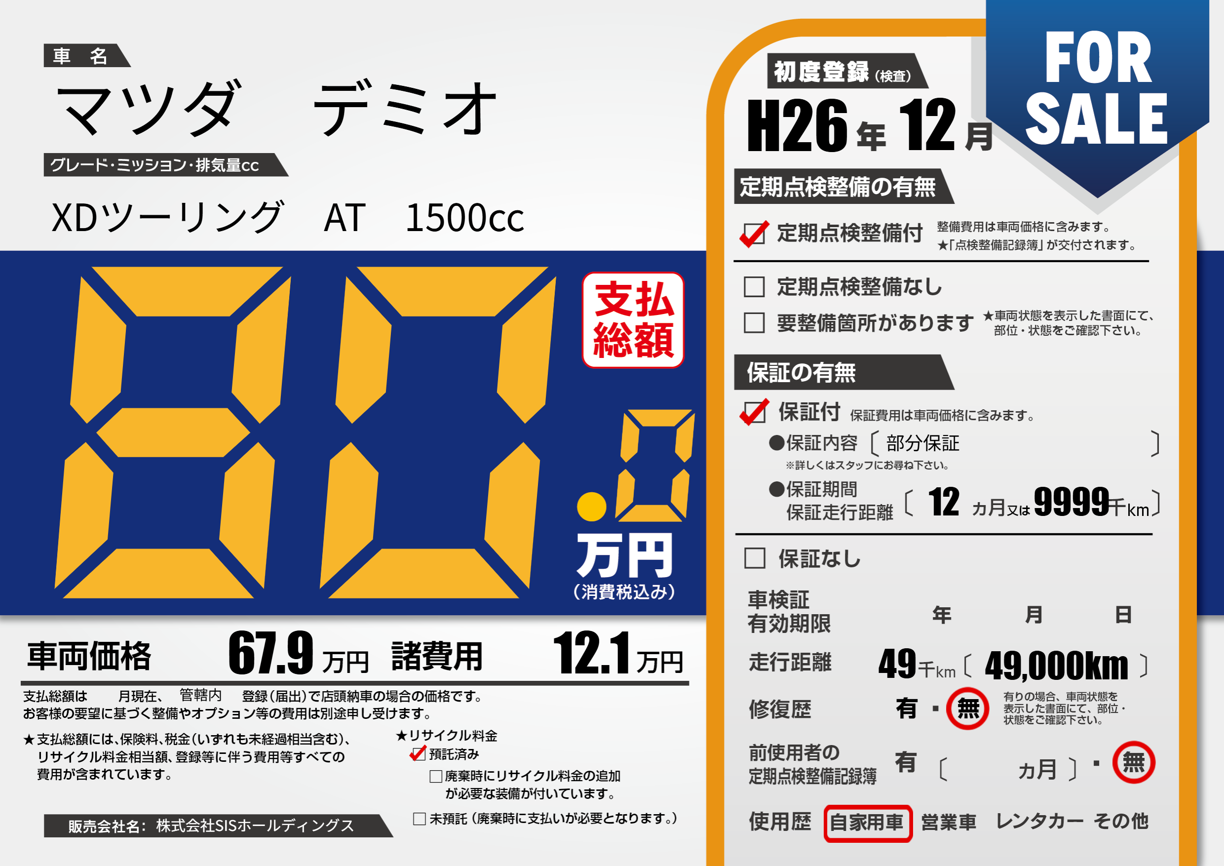 | 車名 | マツダ デミオ | グレード ミッション 排気量 |