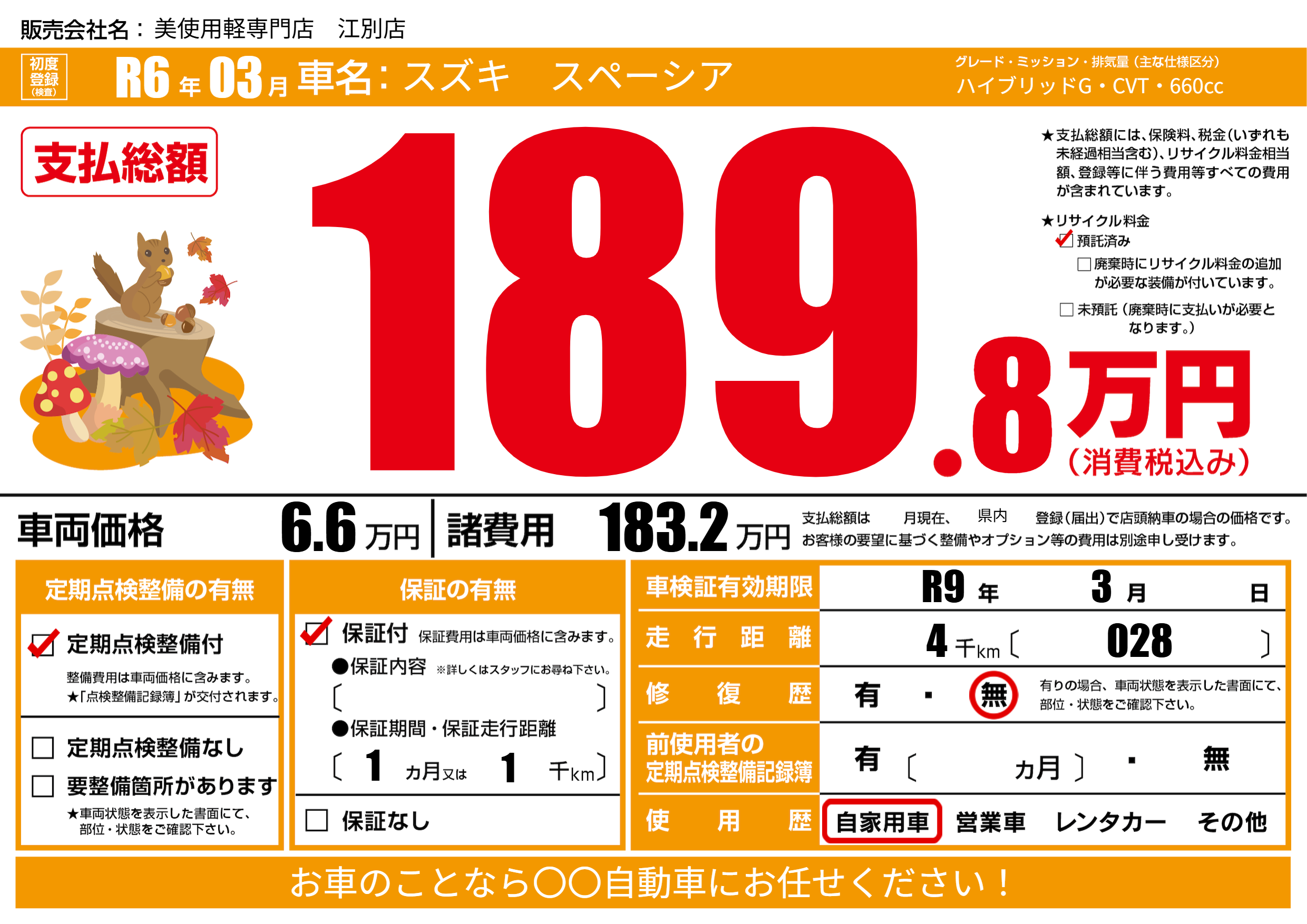 なし | 車検制限 | R9年3月---月 |