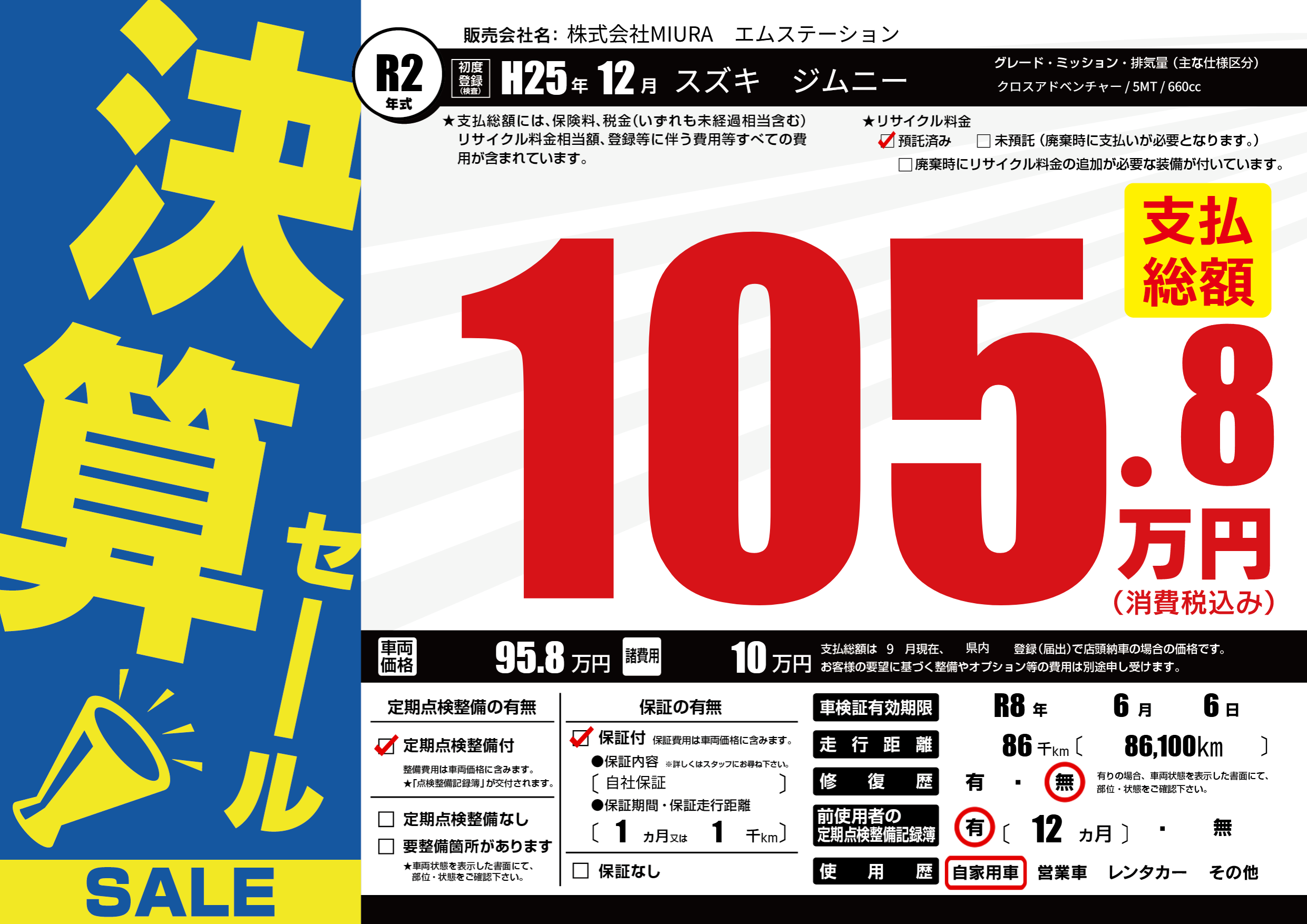 | 車名 | スズキ ジムニー | グレード ミッション 排気量 |