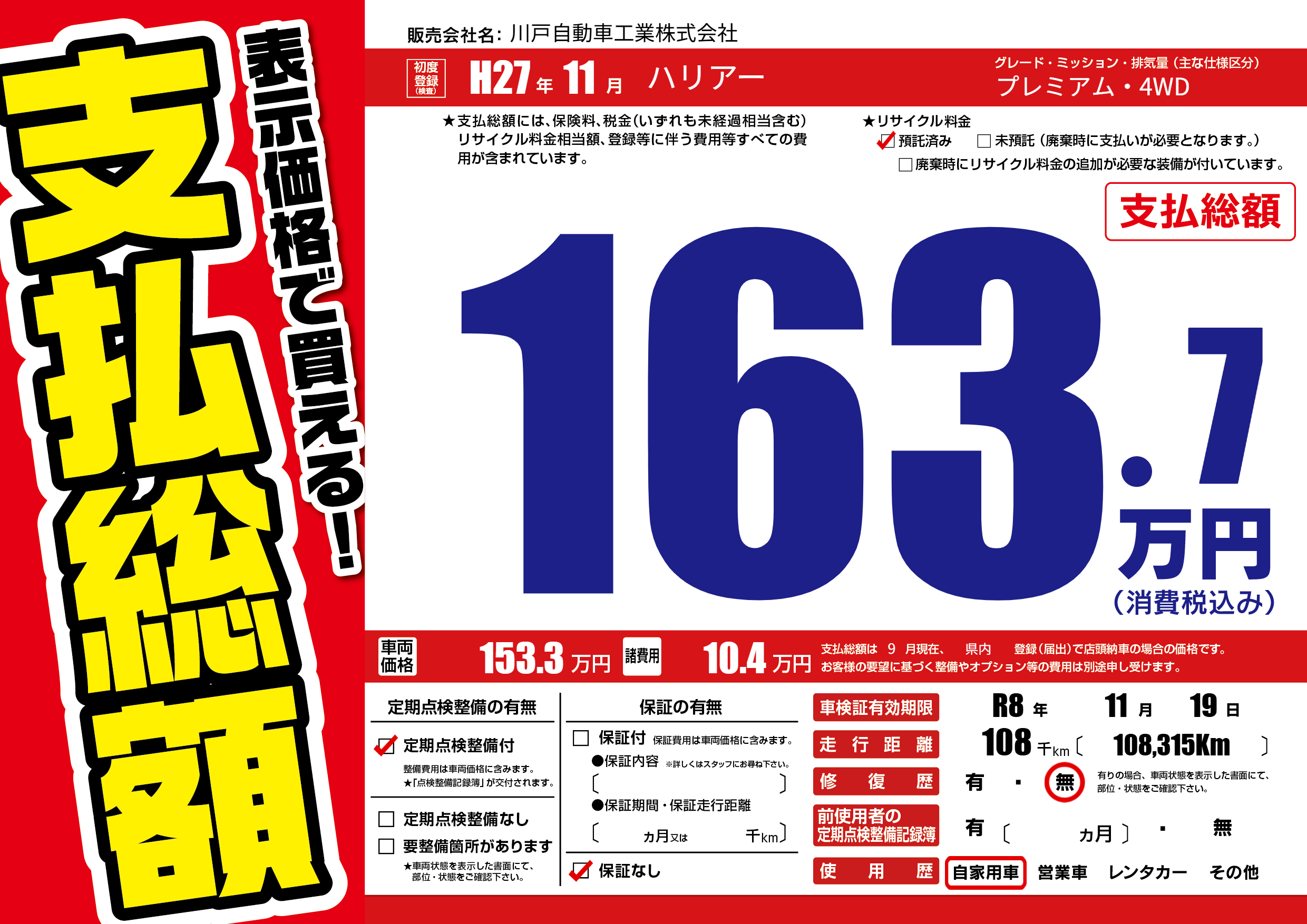 | 走行キロ | 10.8万km | 初年度登録 | H27年11月 |