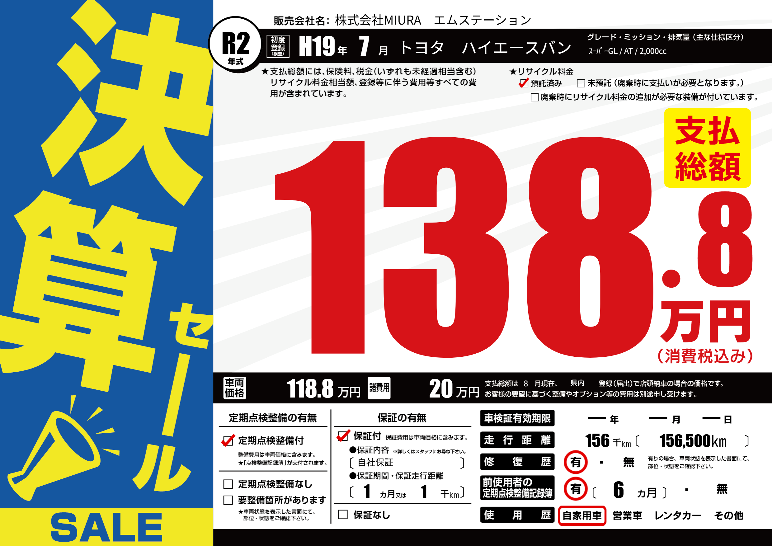 | 走行キロ | 15.6万km | 初年度登録 | H19年7月 |