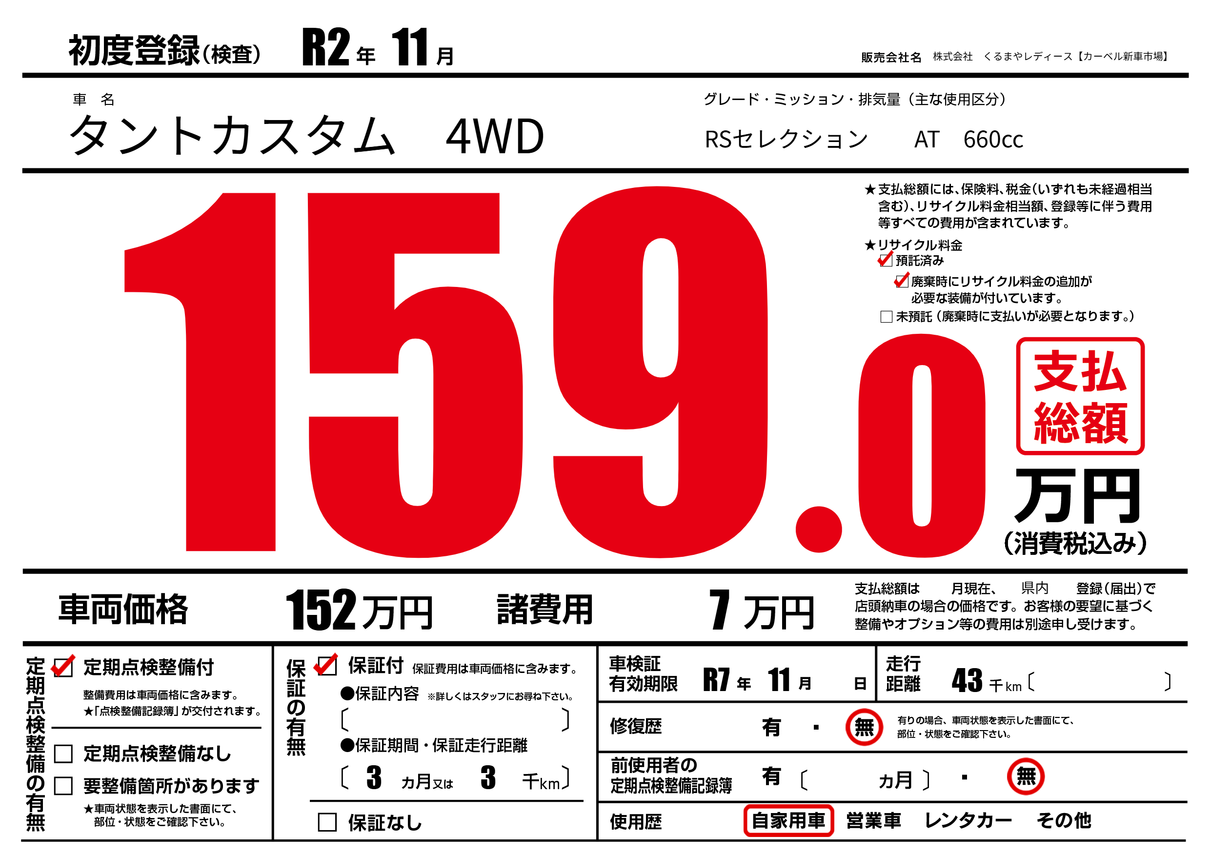 | 車検制限 | R7年 11月 - 日 | ||