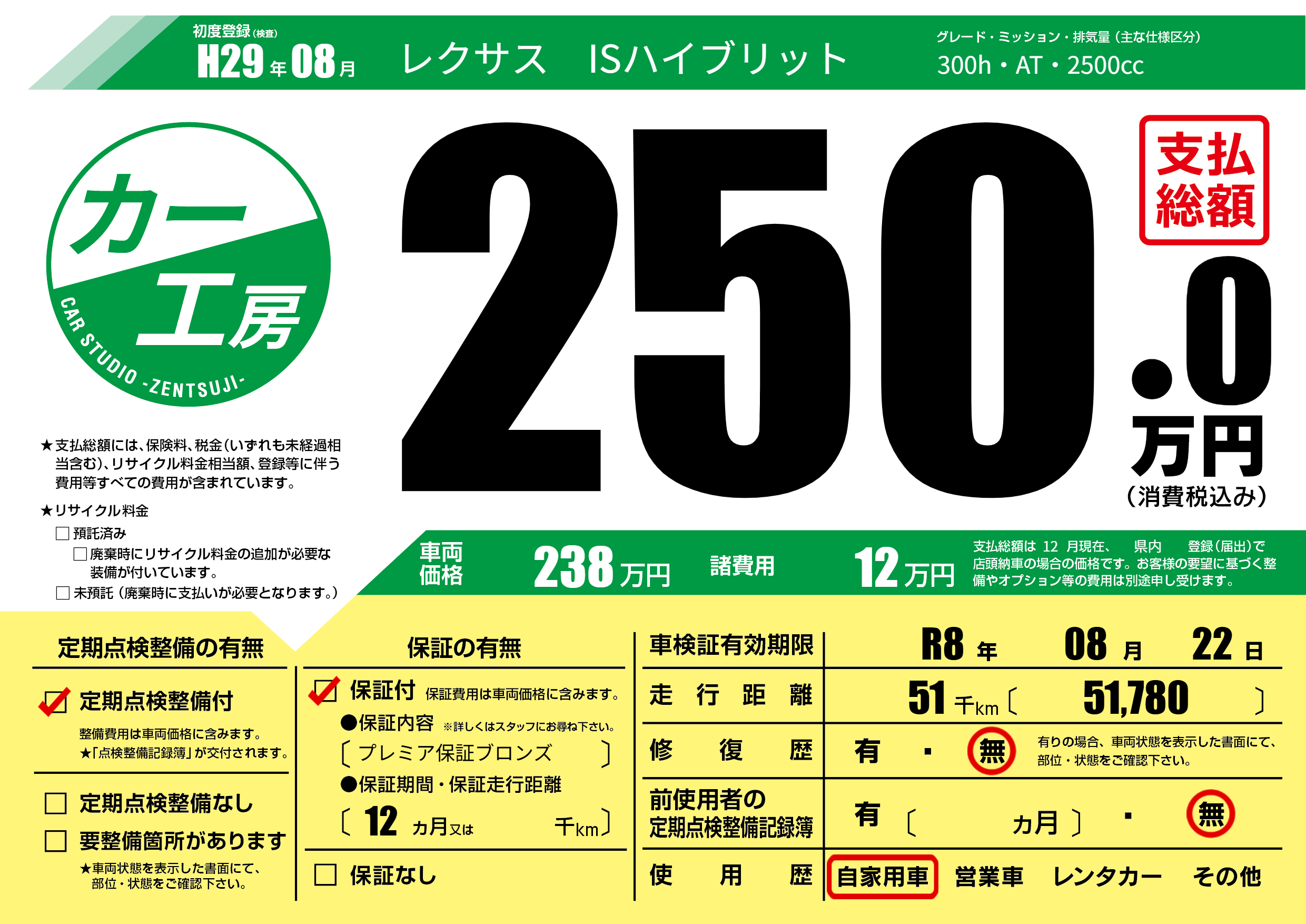 | 車名 | レクサス ISハイブリット | グレード ミッション 排気量 |