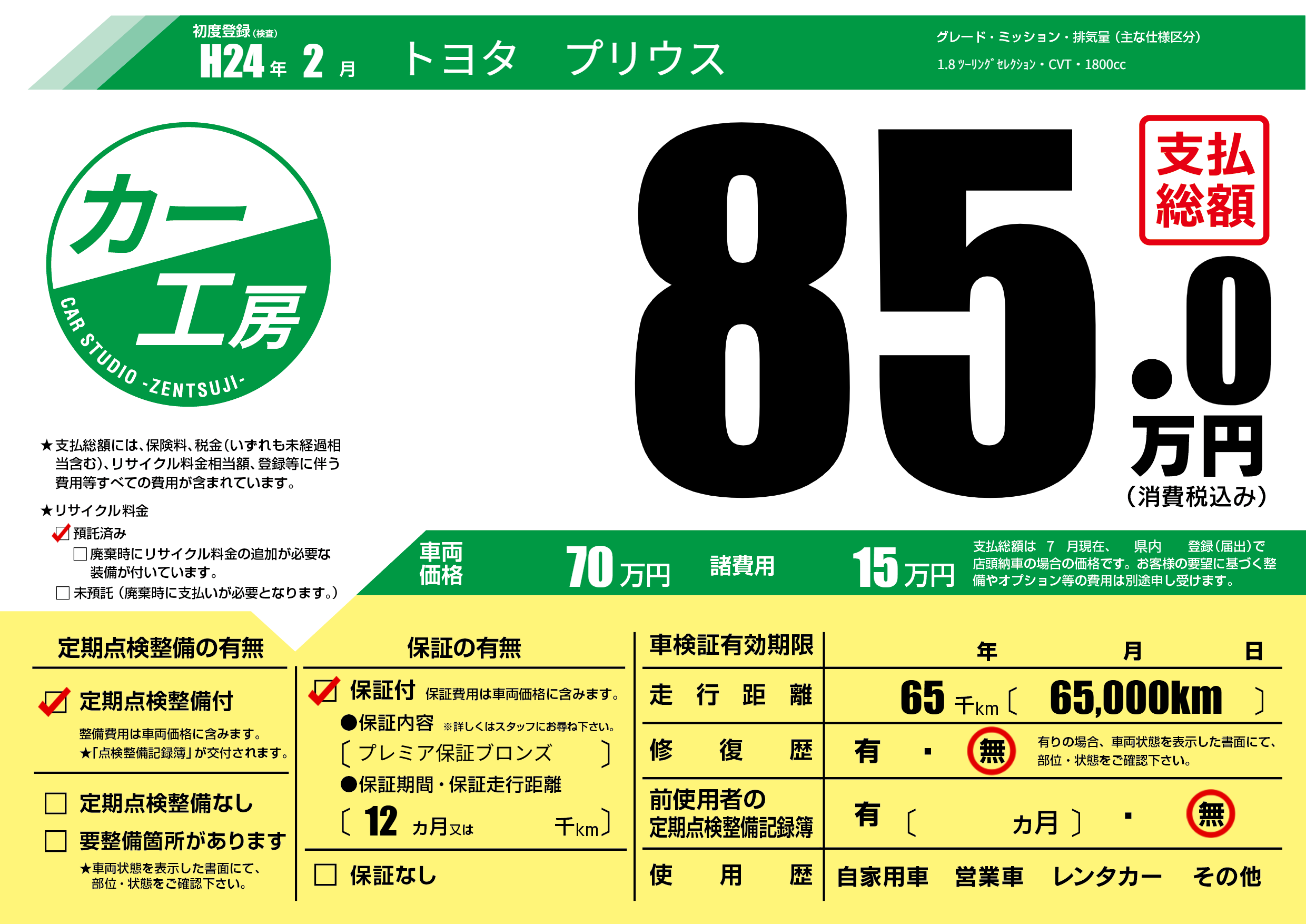 | 車名 | トヨタ プリウス | グレード ミッション 排気量 |
