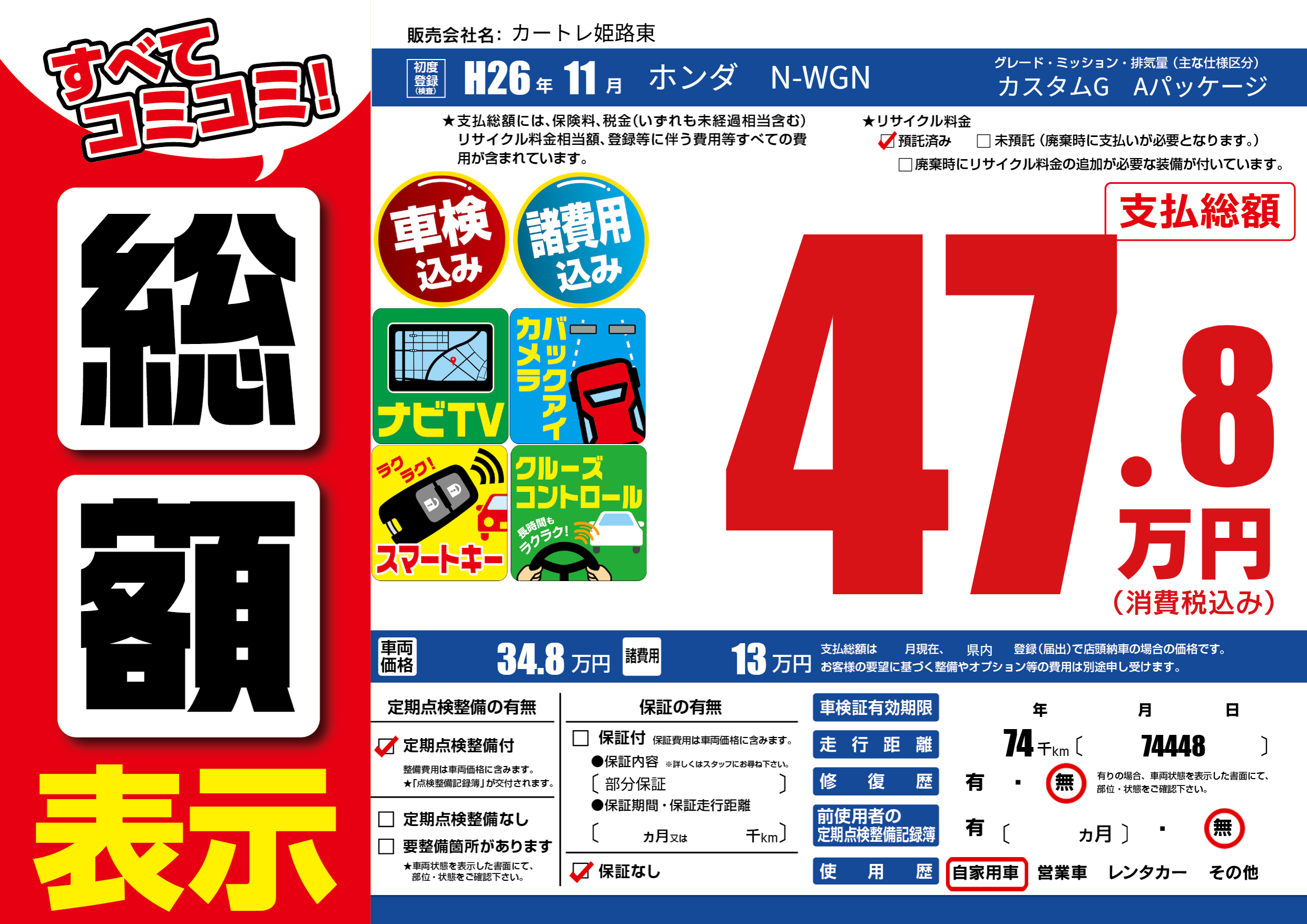 | 車名 | ホンダ N-WGN | グレード ミッション 排気量 |