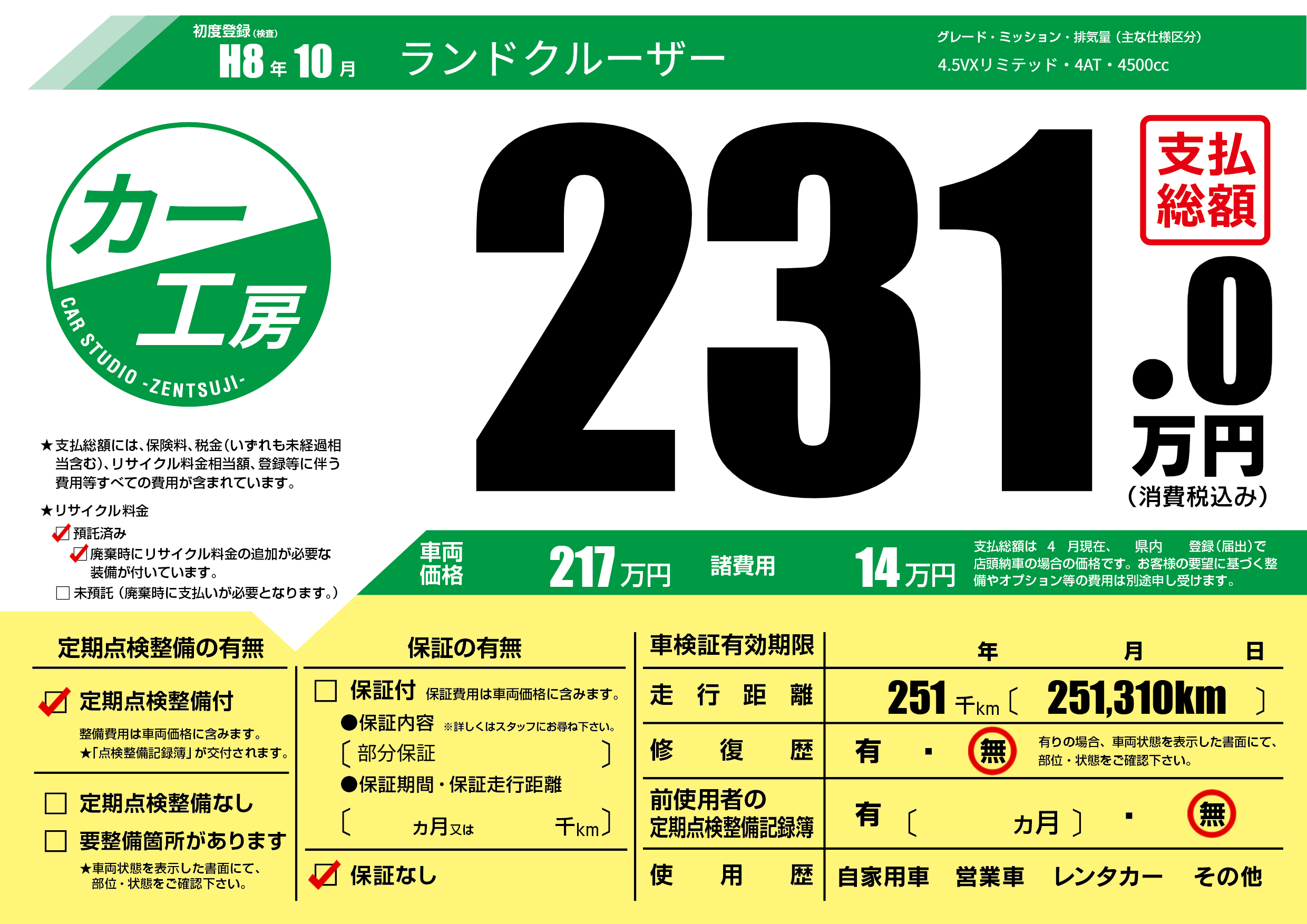 | 走行キロ | 25.1万km | 初年度登録 | H8年10月 |