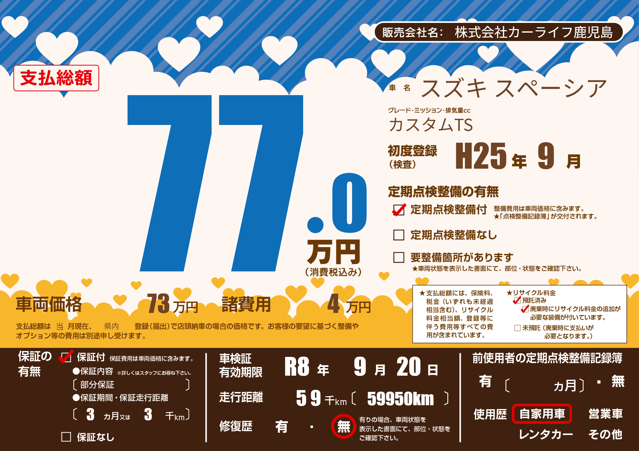 | 走行キロ | 0.5万km | 初年度登録 | H25年9月 |