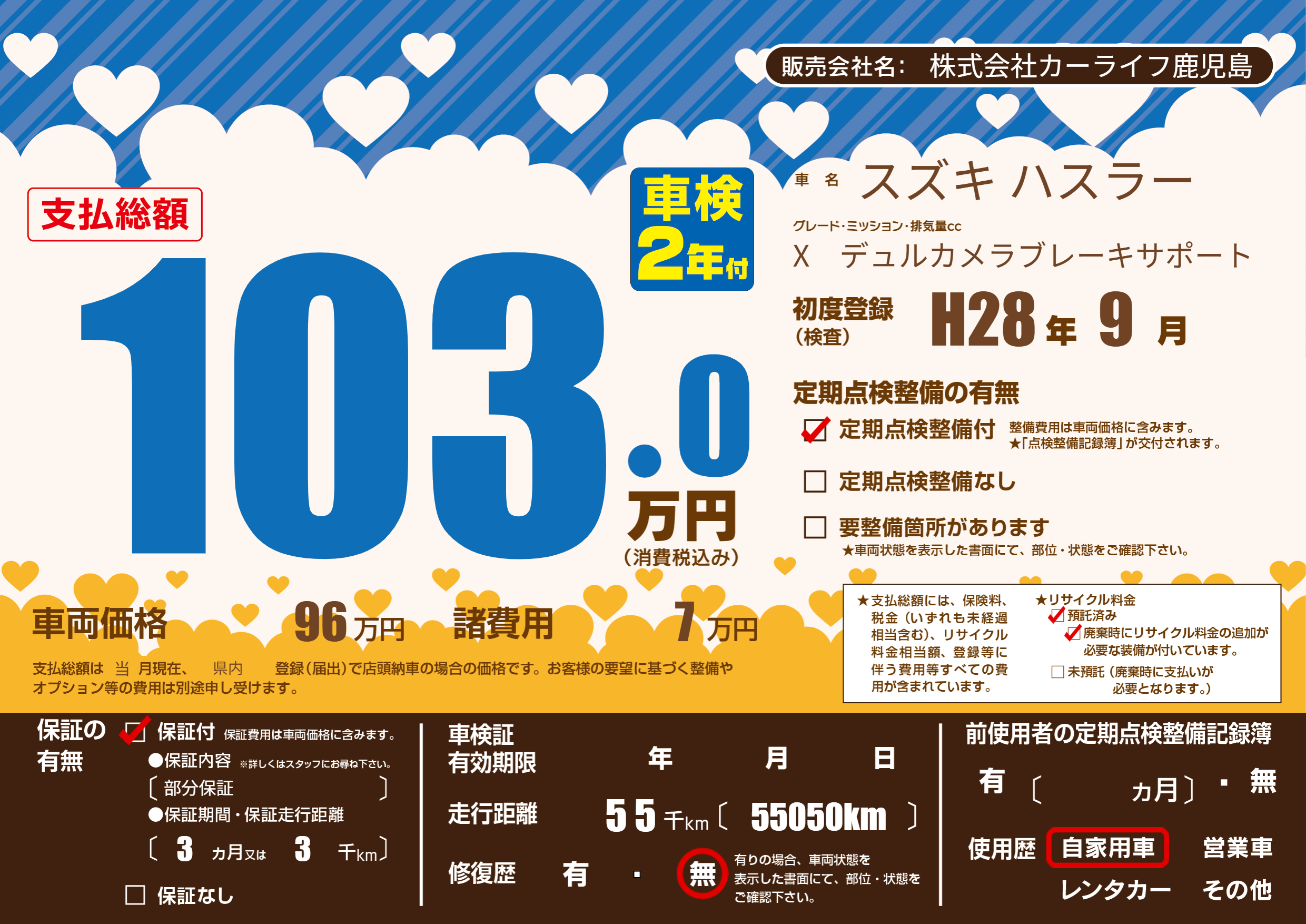 | 車名 | スズキ ハスラー | グレード ミッション 排気量 |
