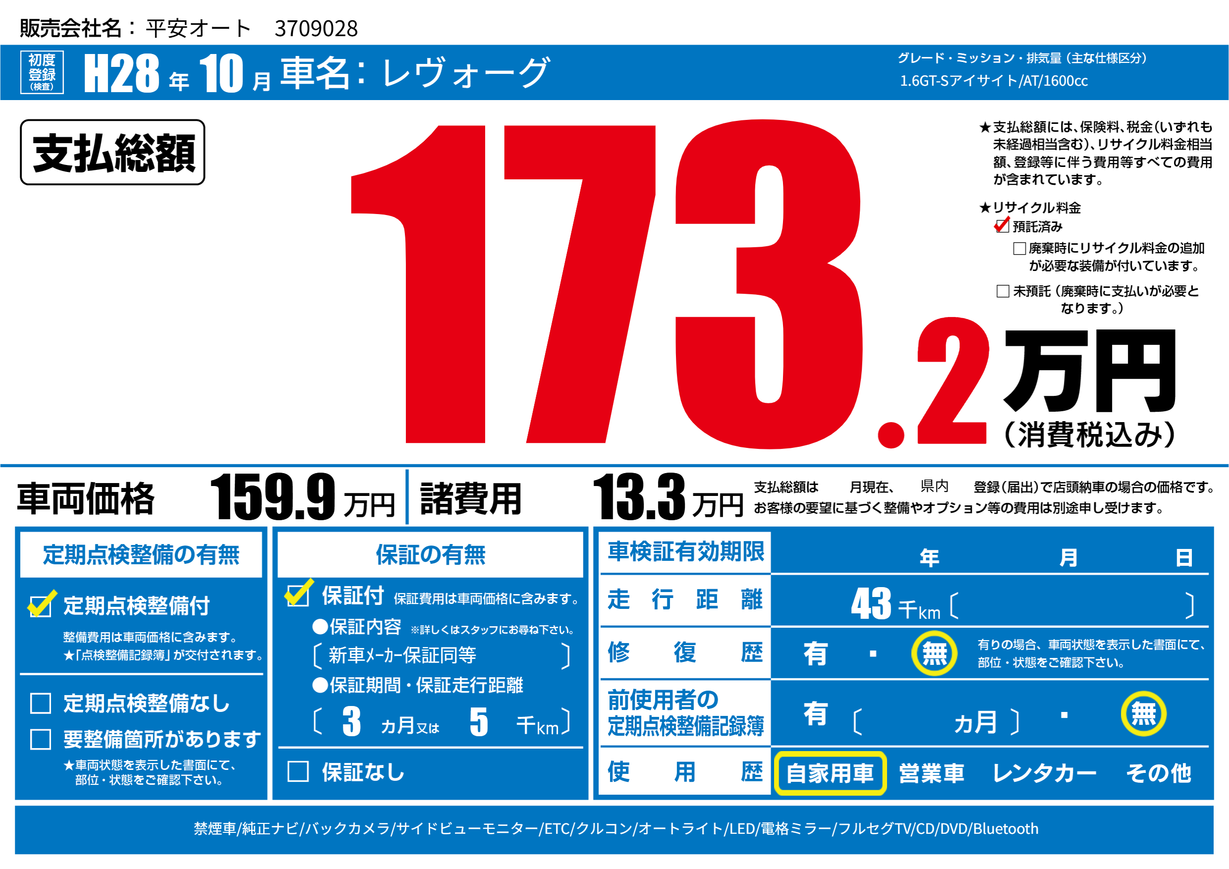 | 車名 | レヴォーグ | グレード ミッション 排気量 |