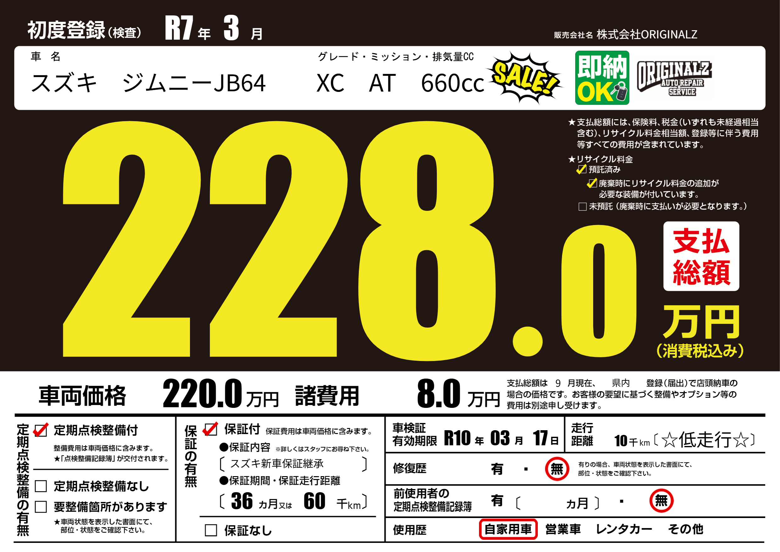 | 車名 | スズキ ジムニーJB64 | グレード ミッション 排気量 |
