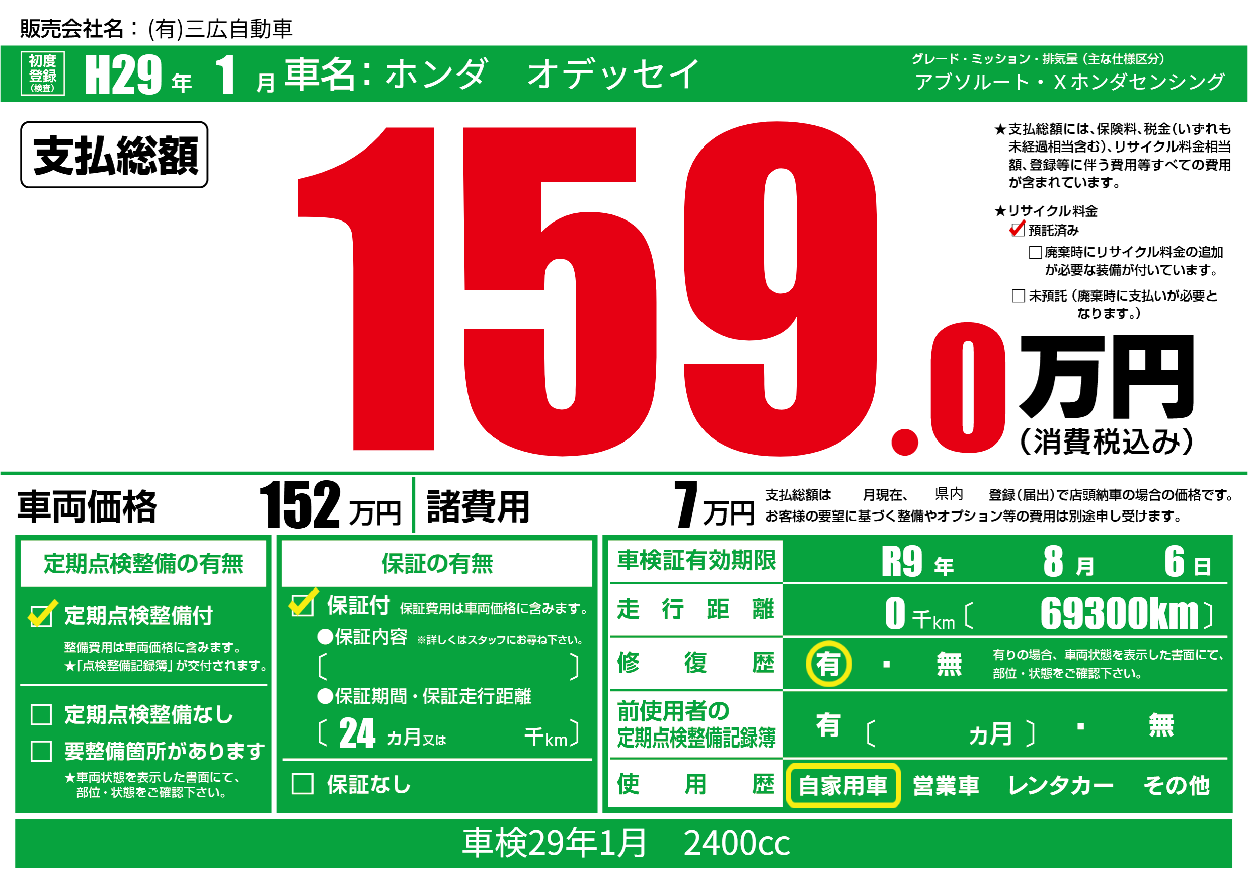 | 車名 | ホンダ オデッセイ | グレード ミッション 排気量 |