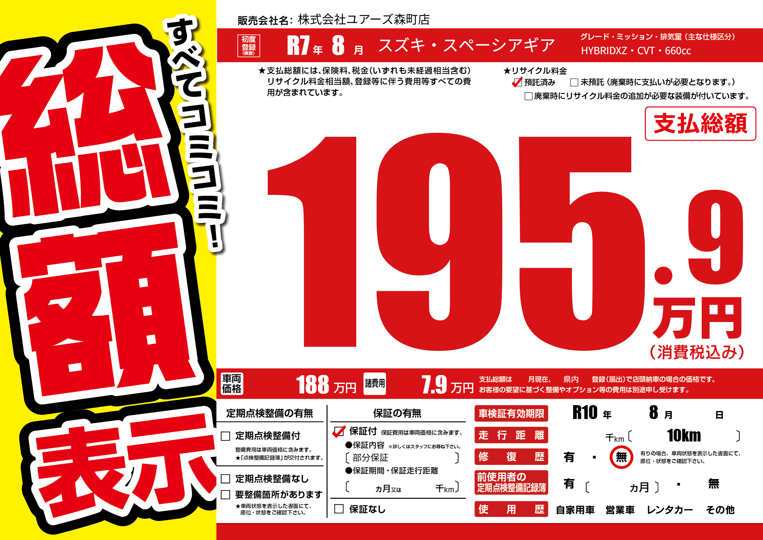 | 走行キロ | - | 初年度登録 | R7年8月 |