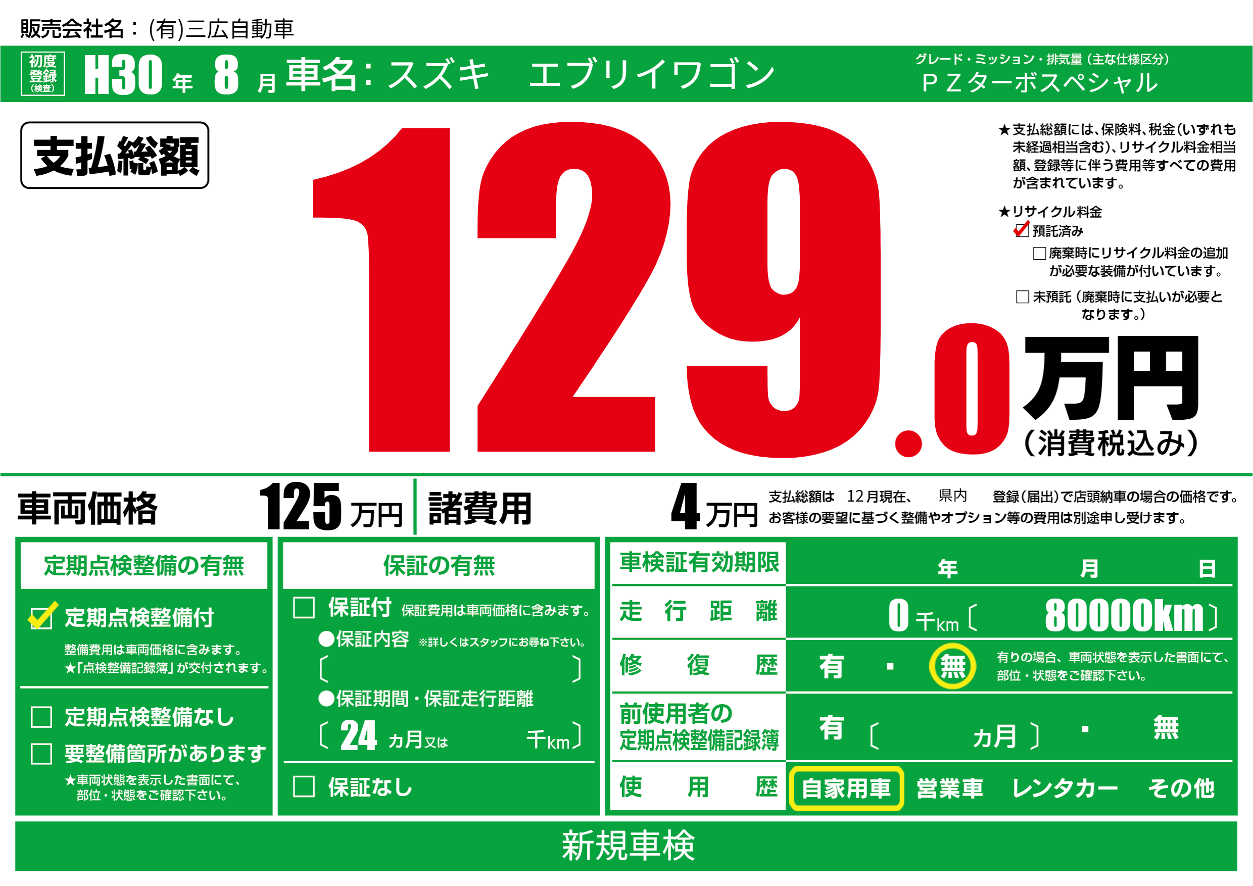 | 車名 | スズキ エブリイワゴン | グレード ミッション 排気量 |