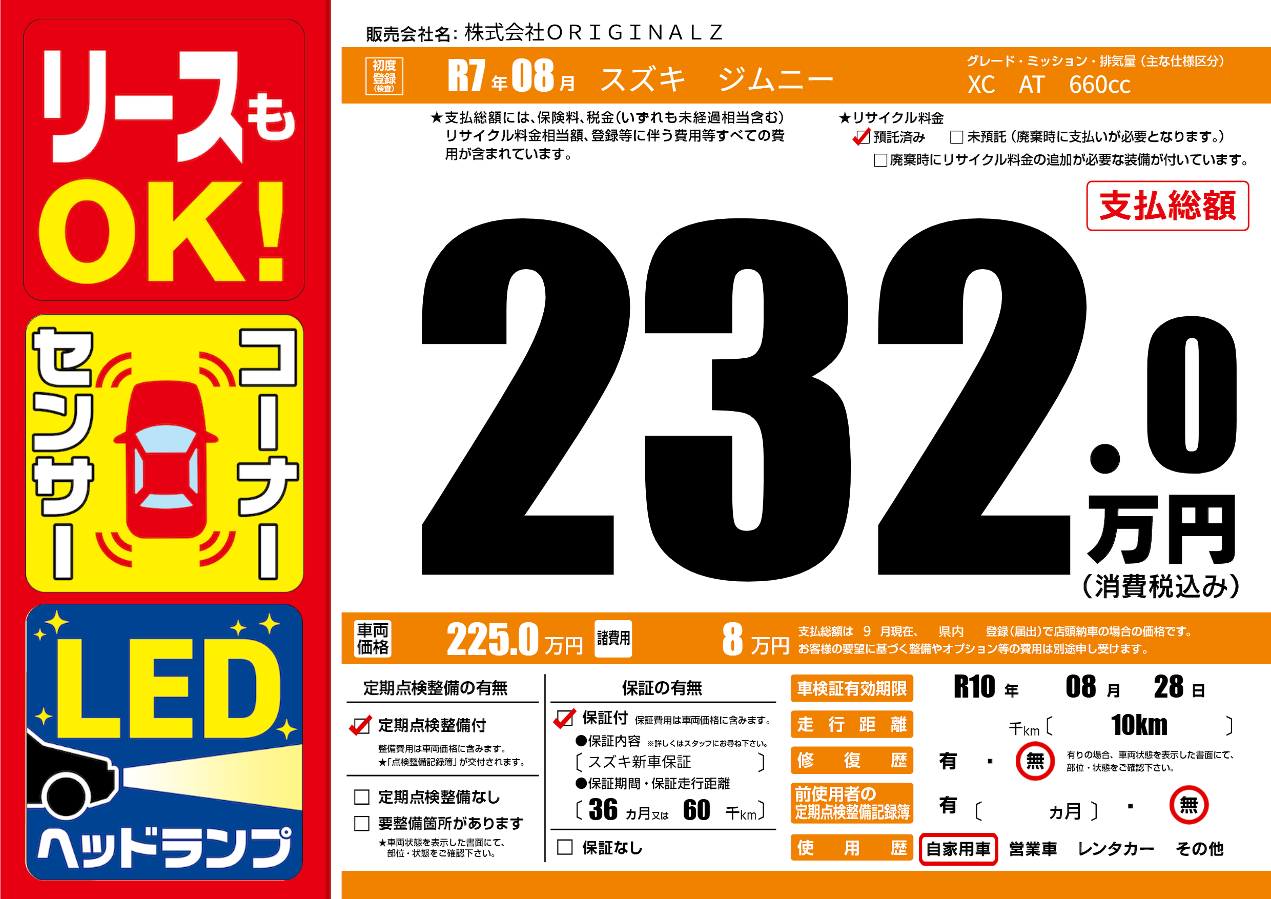 | 走行キロ | - | 初年度登録 | R7年08月 |