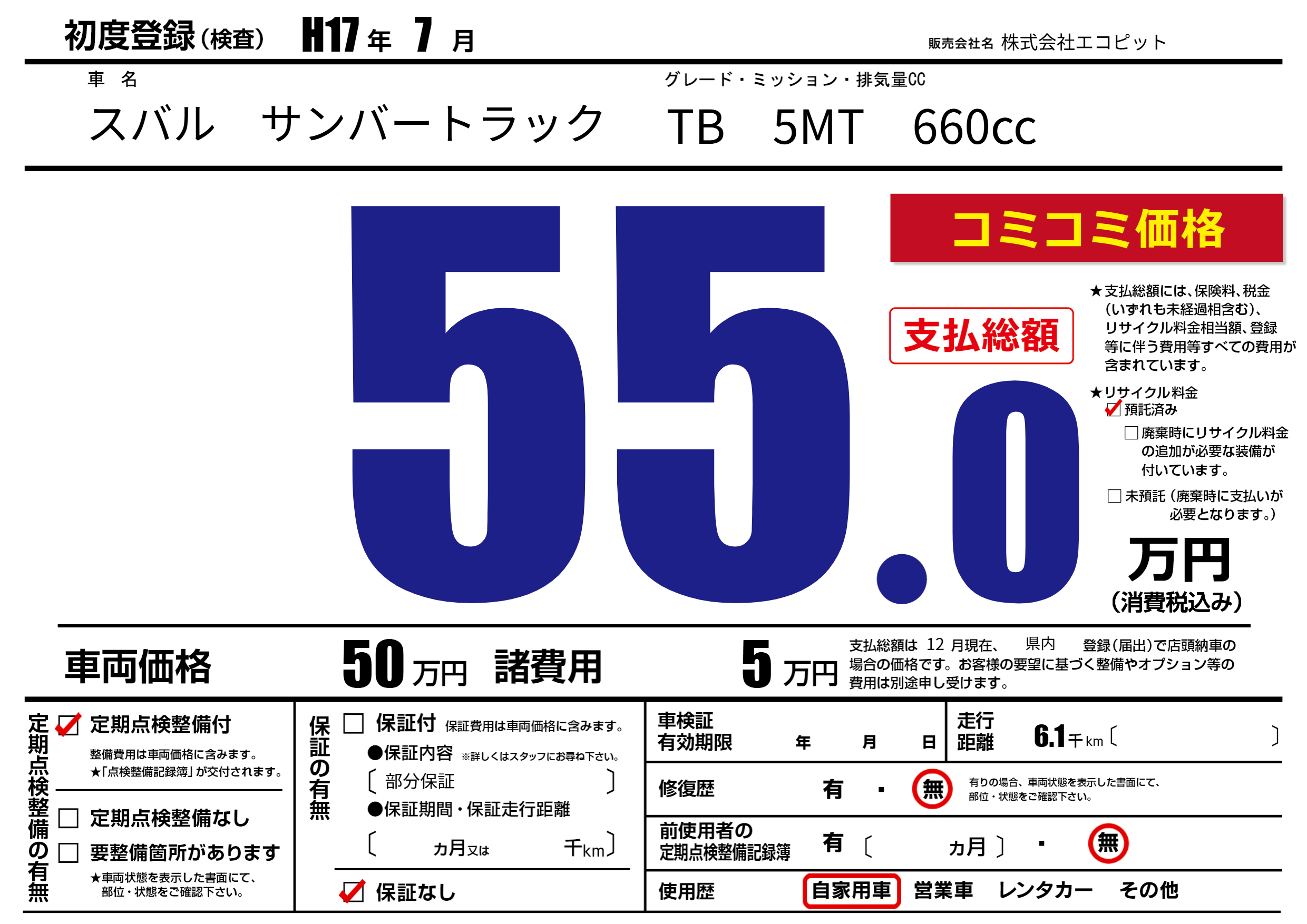 | 車名 | スバル サンバートラック | グレード ミッション 排気量 |