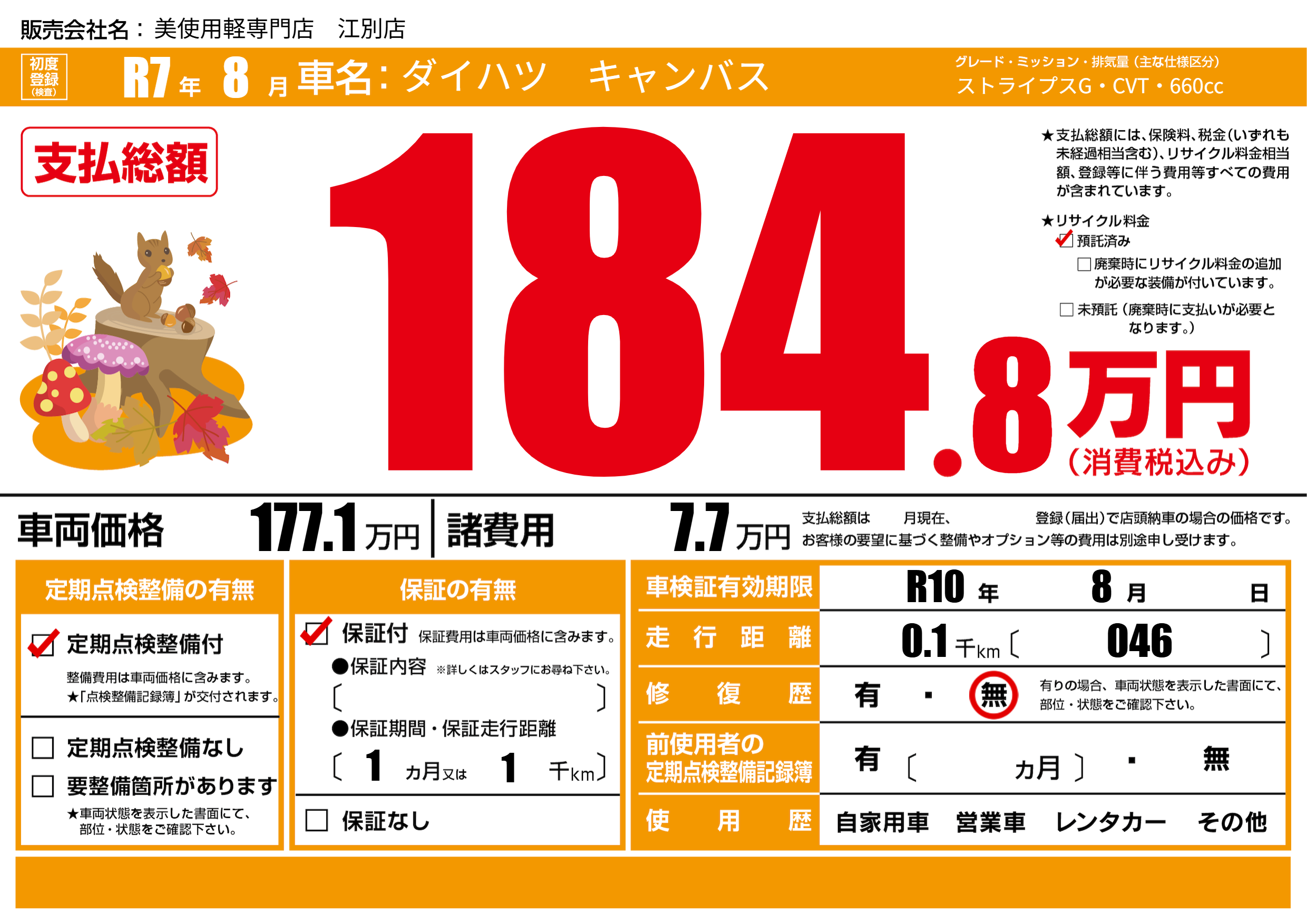 | 走行キロ | - | 初年度登録 | R7年8月 |