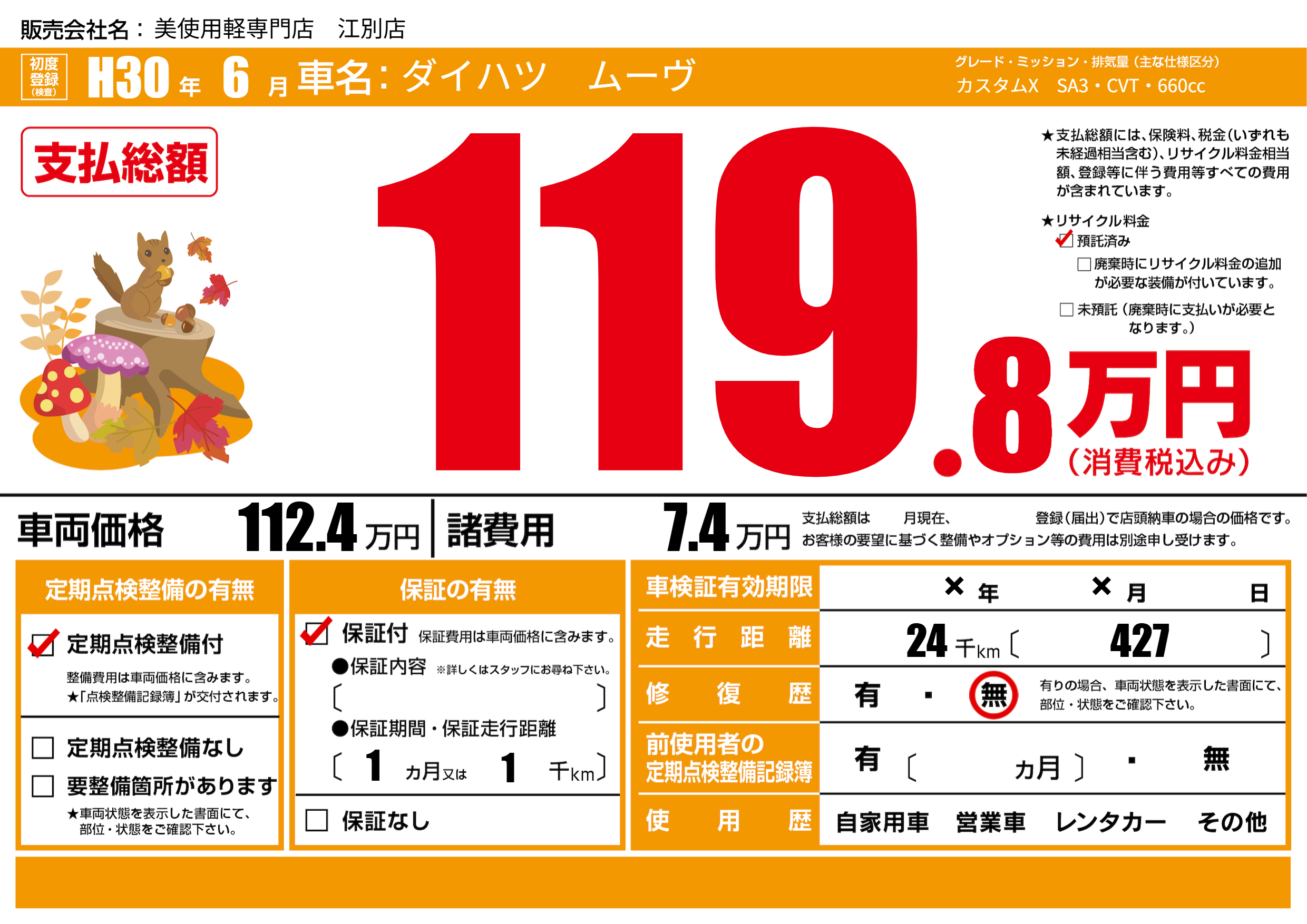 | 走行キロ | 2.4万km | 初年度登録 | H30年6月 |