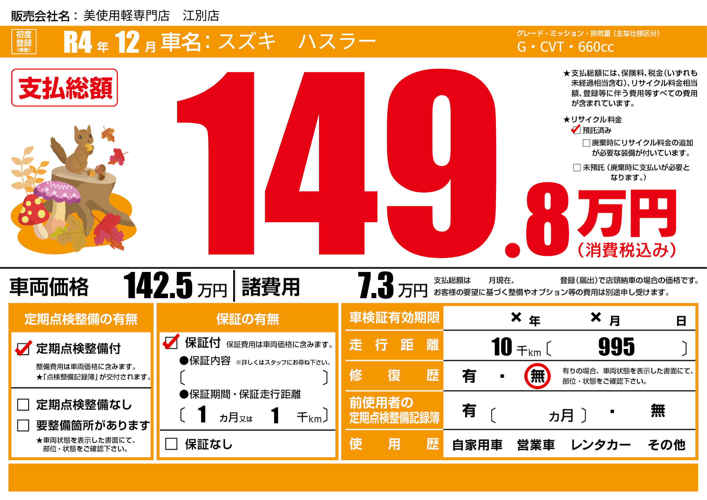 | 車名 | スズキ ハスラー | グレード ミッション 排気量 |