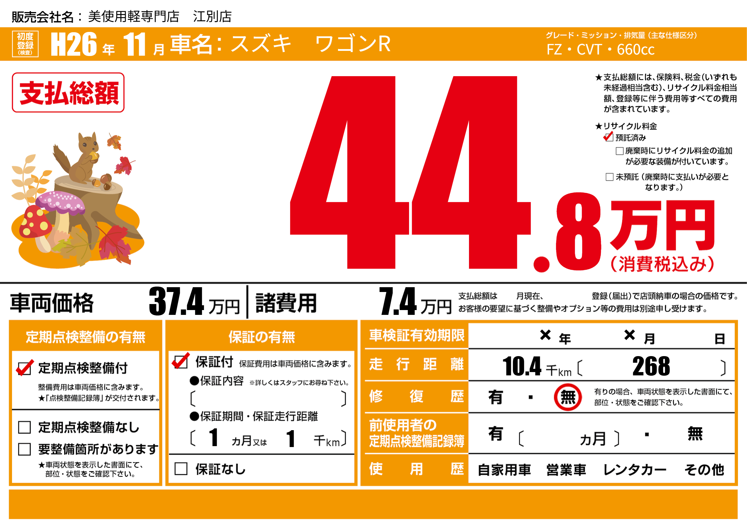 | 走行キロ | 1万km | 初年度登録 | H26年11月 |