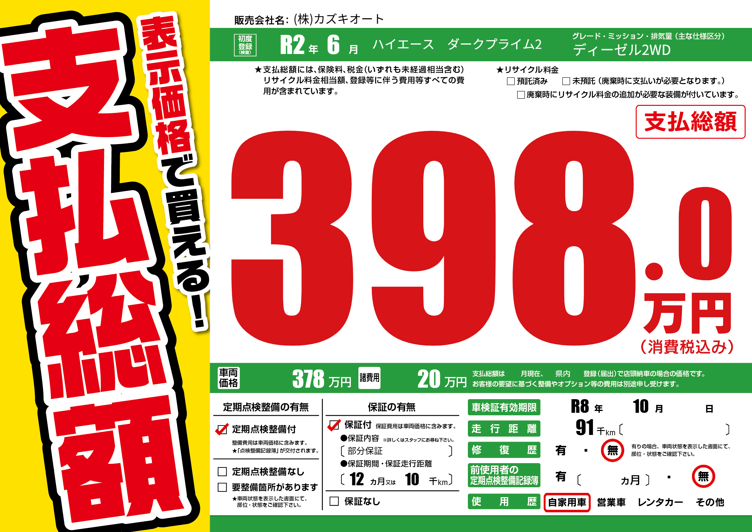 | 走行キロ | 9.1万km | 初年度登録 | R2年6月 |