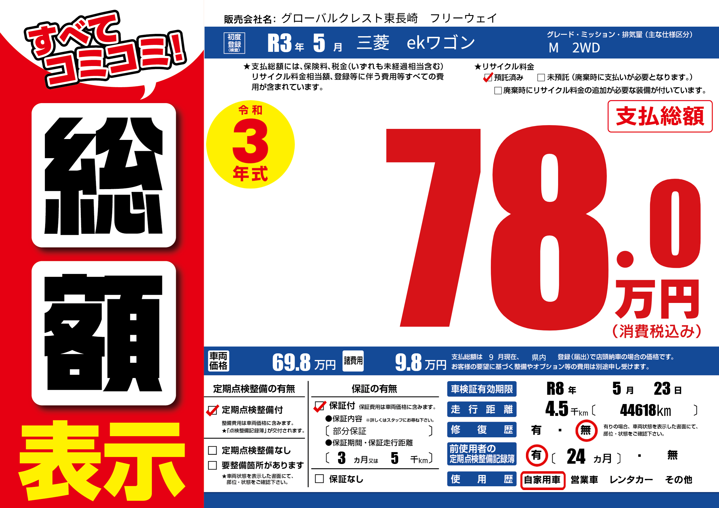 | 車名 | 三菱 ekワゴン | グレード ミッション 排気量 |