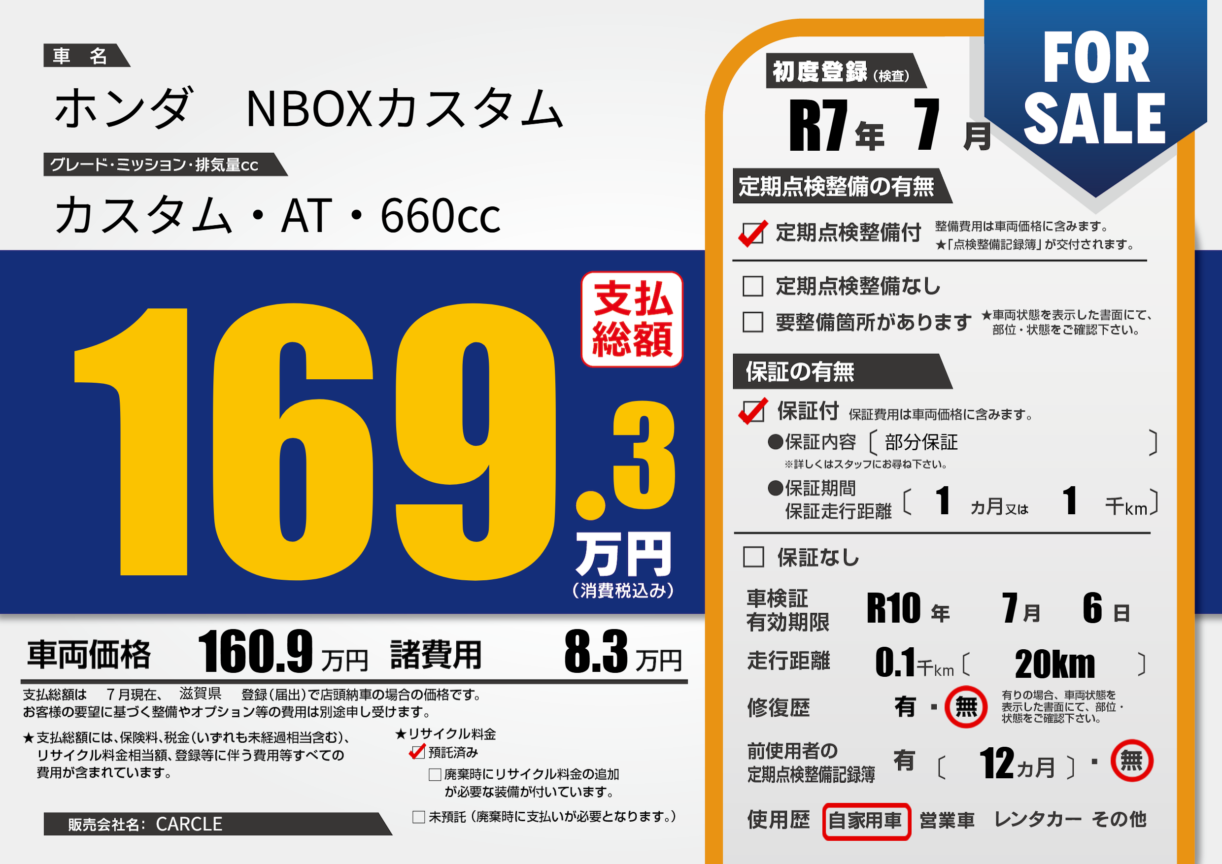 | 走行キロ | - | 初年度登録 | R7年7月 |