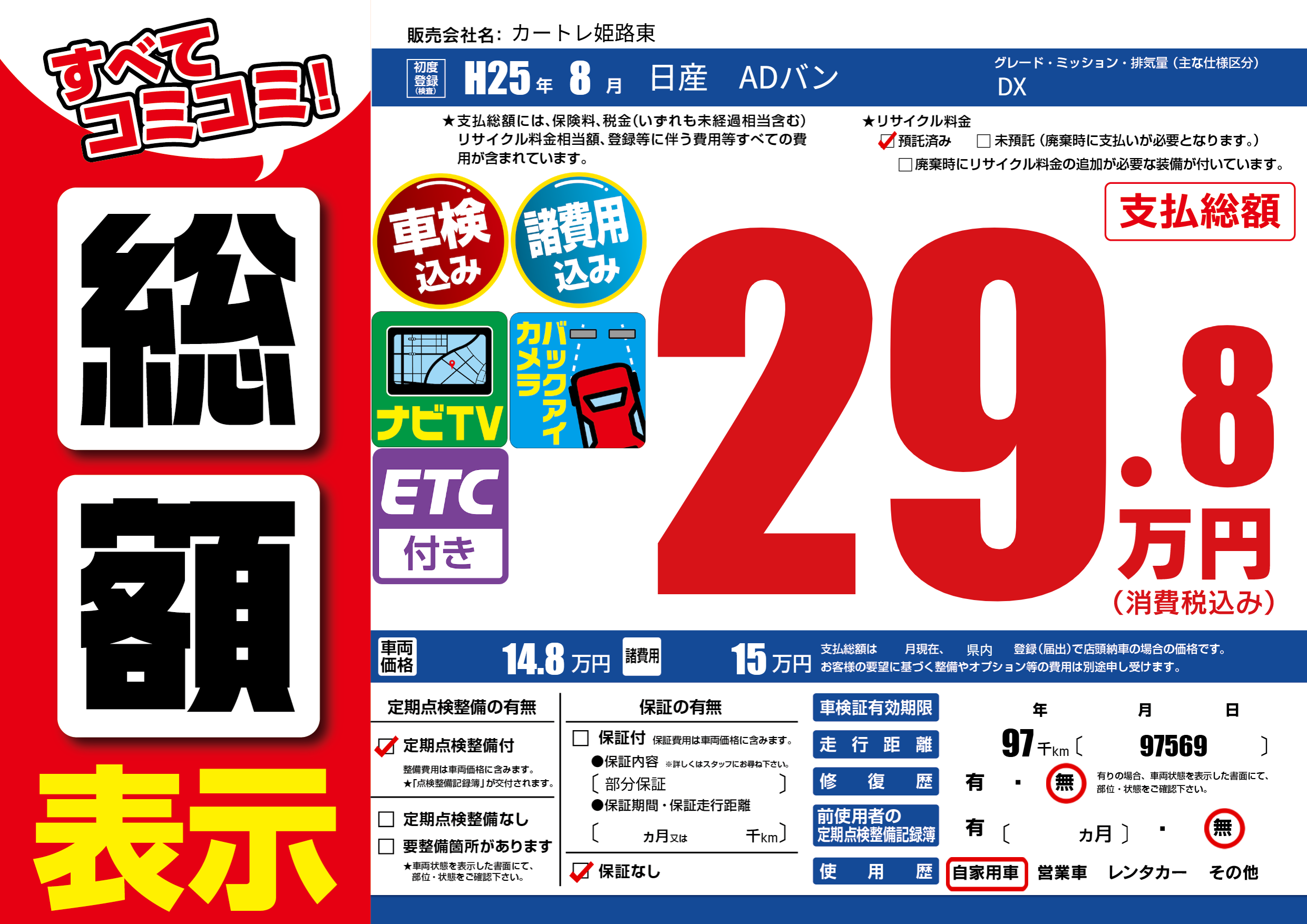 | 車名 | 日産 ADバン | グレード ミッション 排気量 |