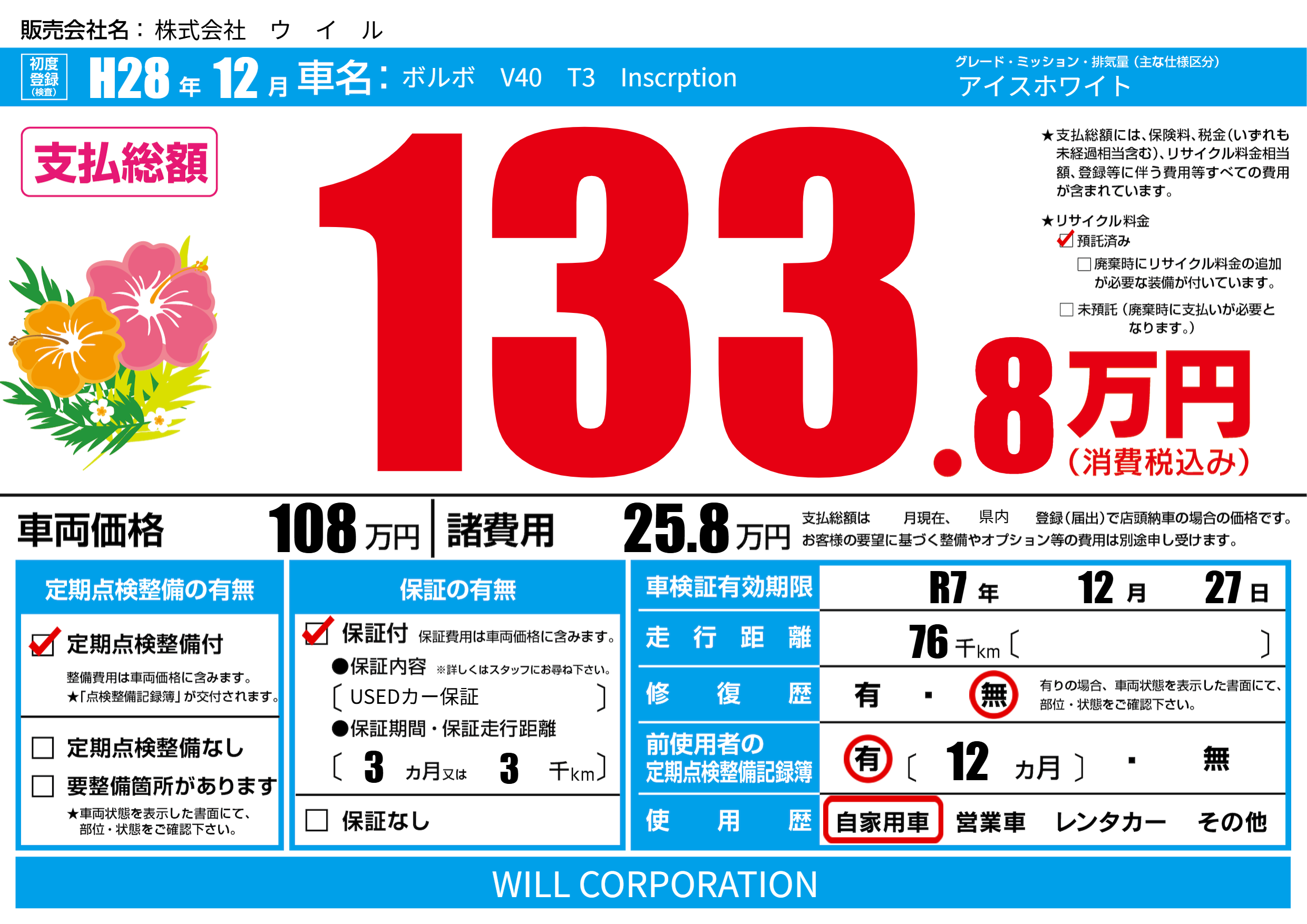 | 車名 | ボルボ V40 T3 Inscrption | グレード ミッション 排気量 |
