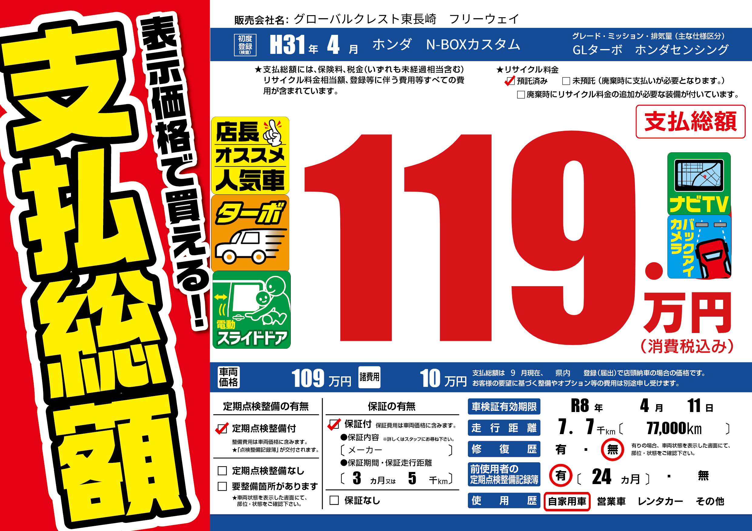 | 車名 | ホンダ N-BOXカスタム | グレード ミッション 排気量 |
