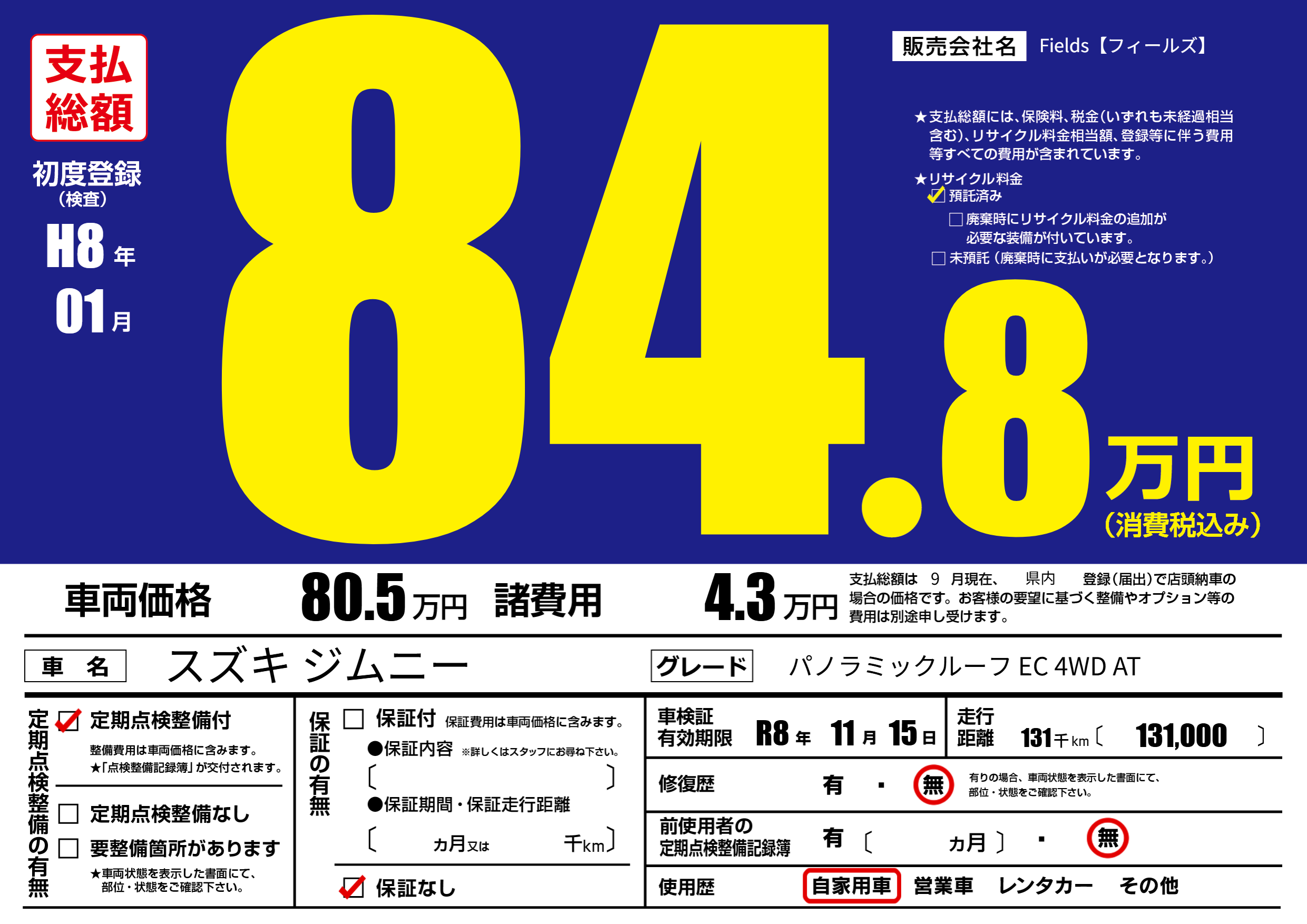 | 走行キロ | 13.1万km | 初年度登録 | H8年01月 |