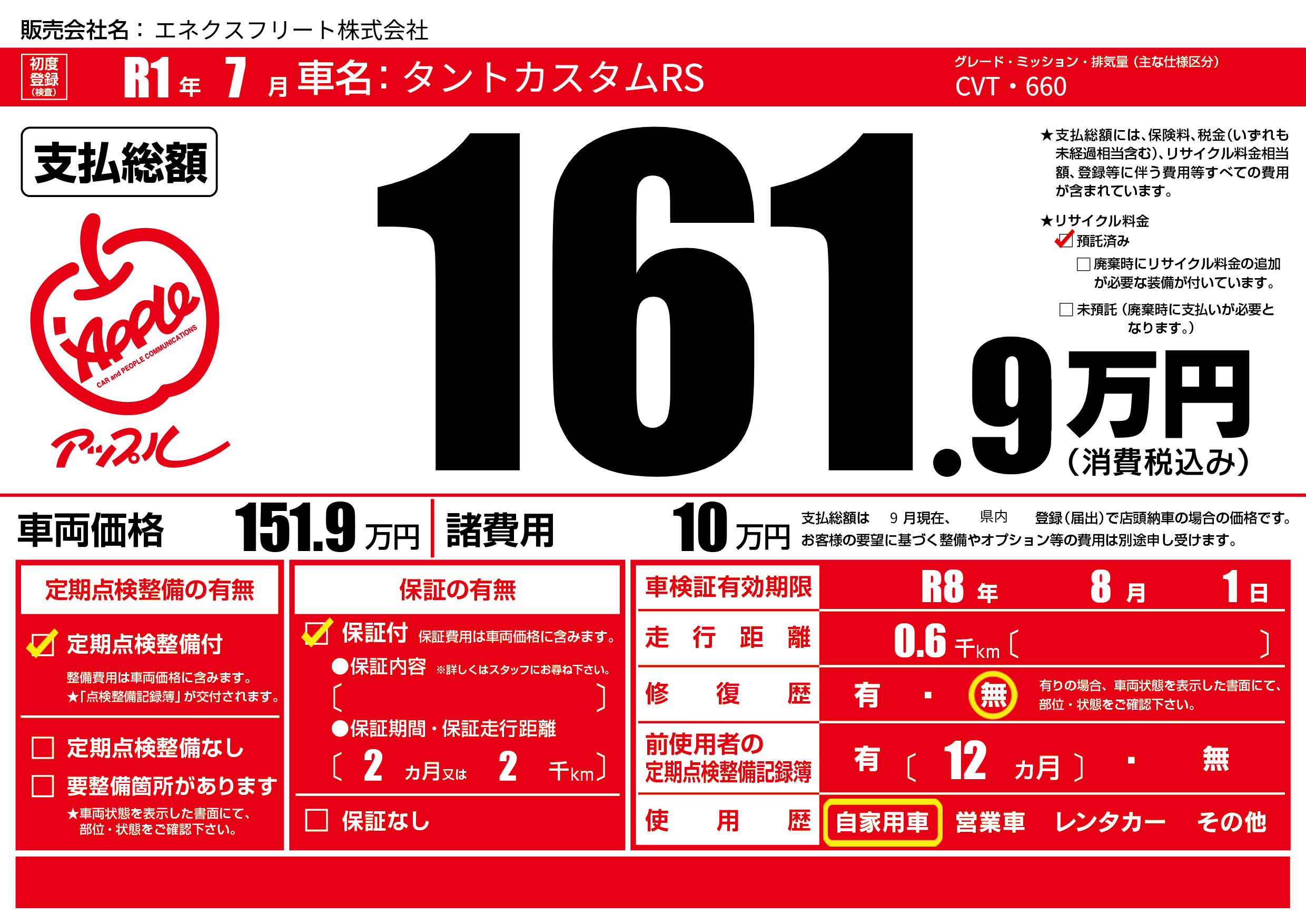 | 車名 | タントカスタムRS | グレード ミッション 排気量 |