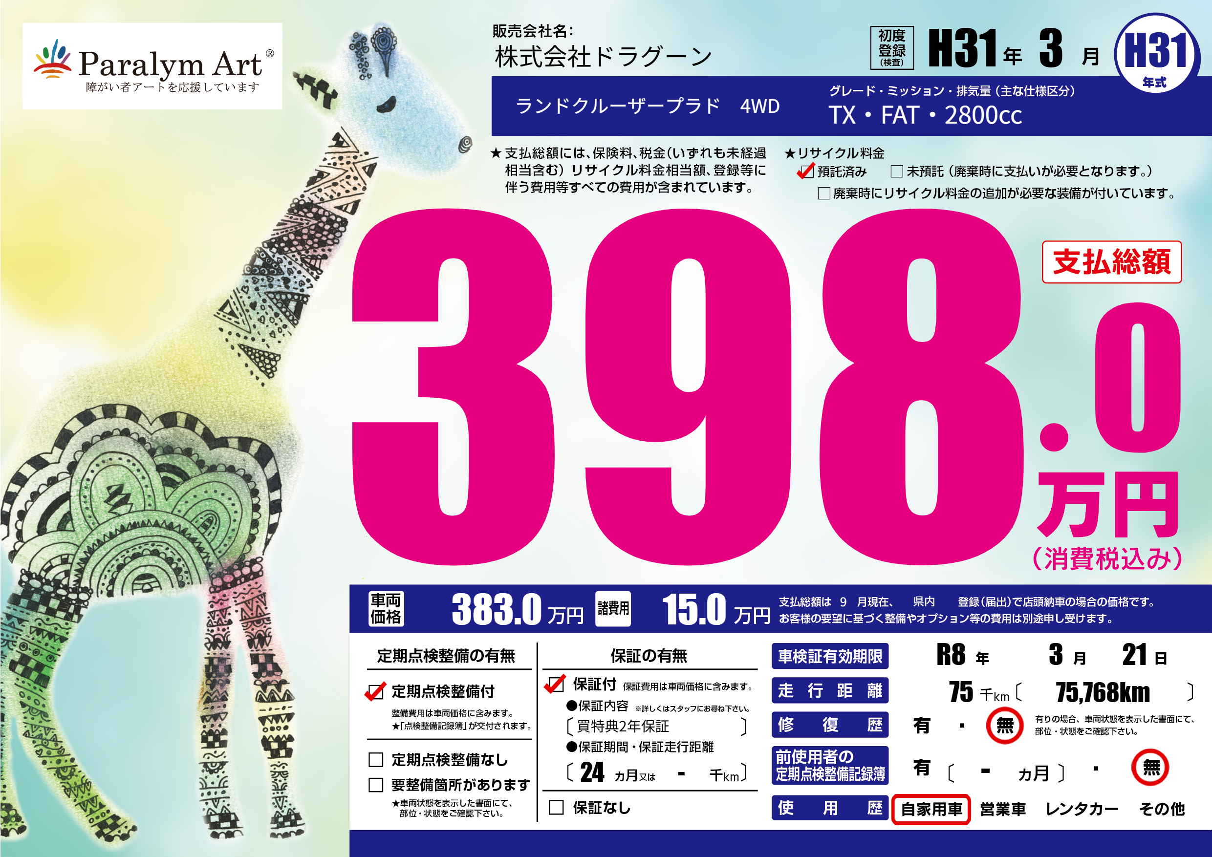 | 車名 | ランドクルーザープラド 4WD | グレード ミッション 排気量 |