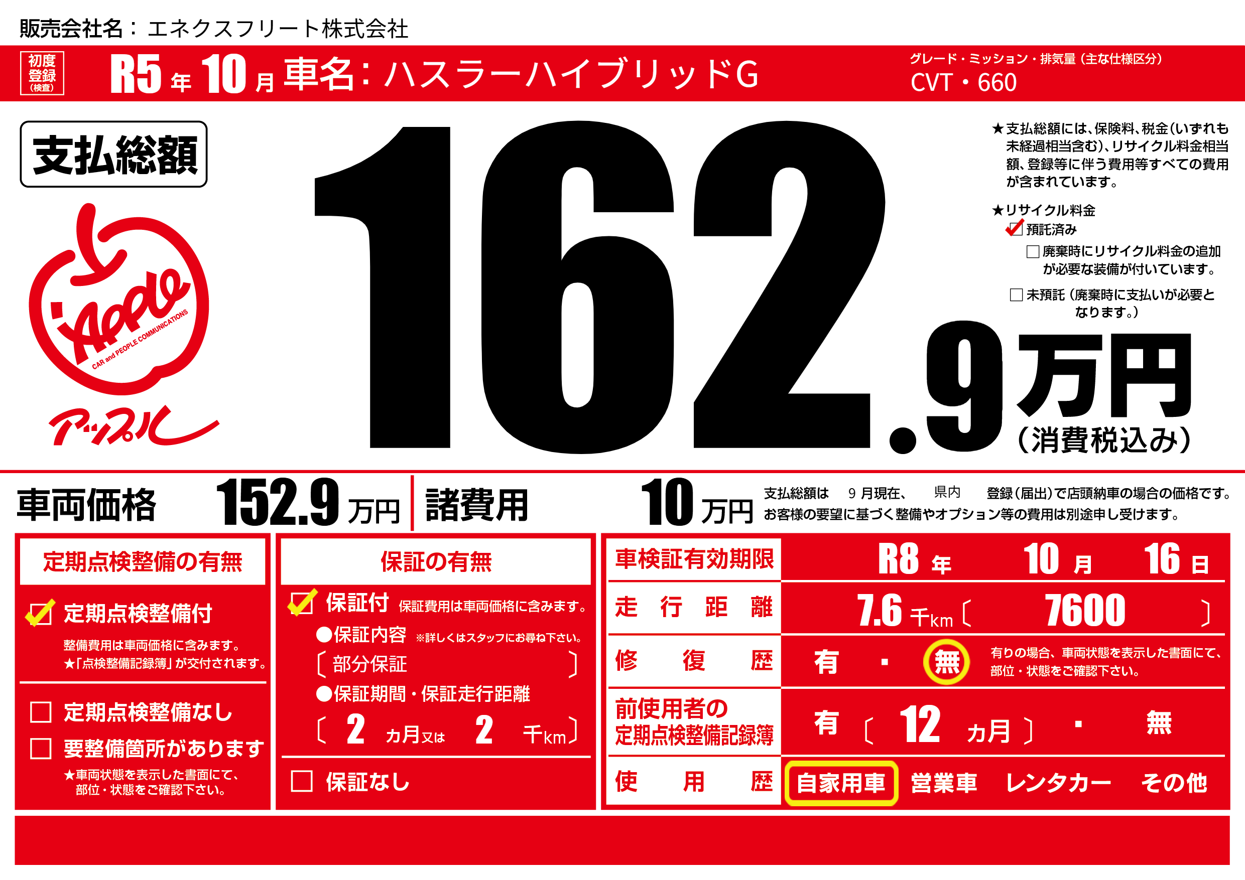 | 車名 | ハスラーハイブリッドG | グレード ミッション 排気量 |