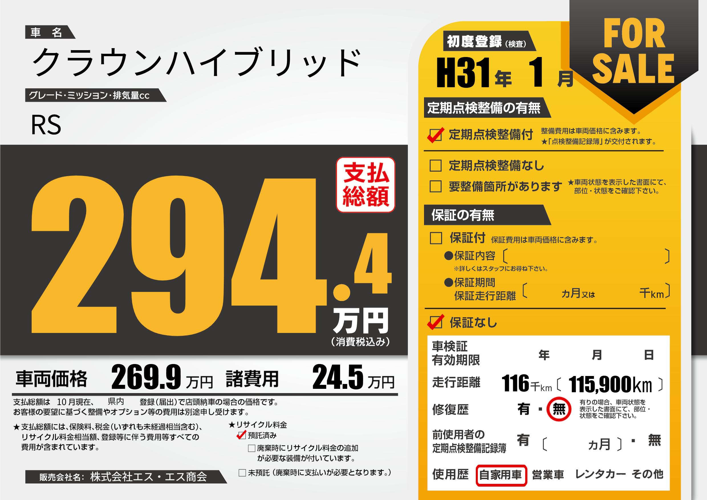 | 車名 | クラウンハイブリッド | グレード ミッション 排気量 |