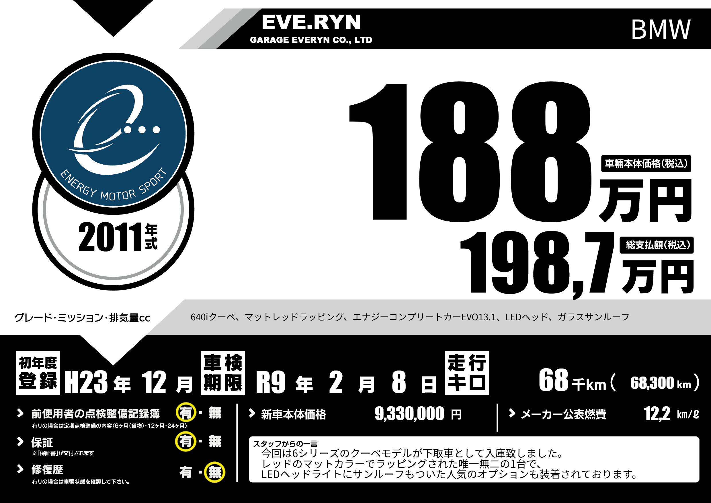 640iクーペ、マットレッドラッピング、エナジーコンプリートカーEVO13.1、LEDヘッド、ガラスサンルーフ |