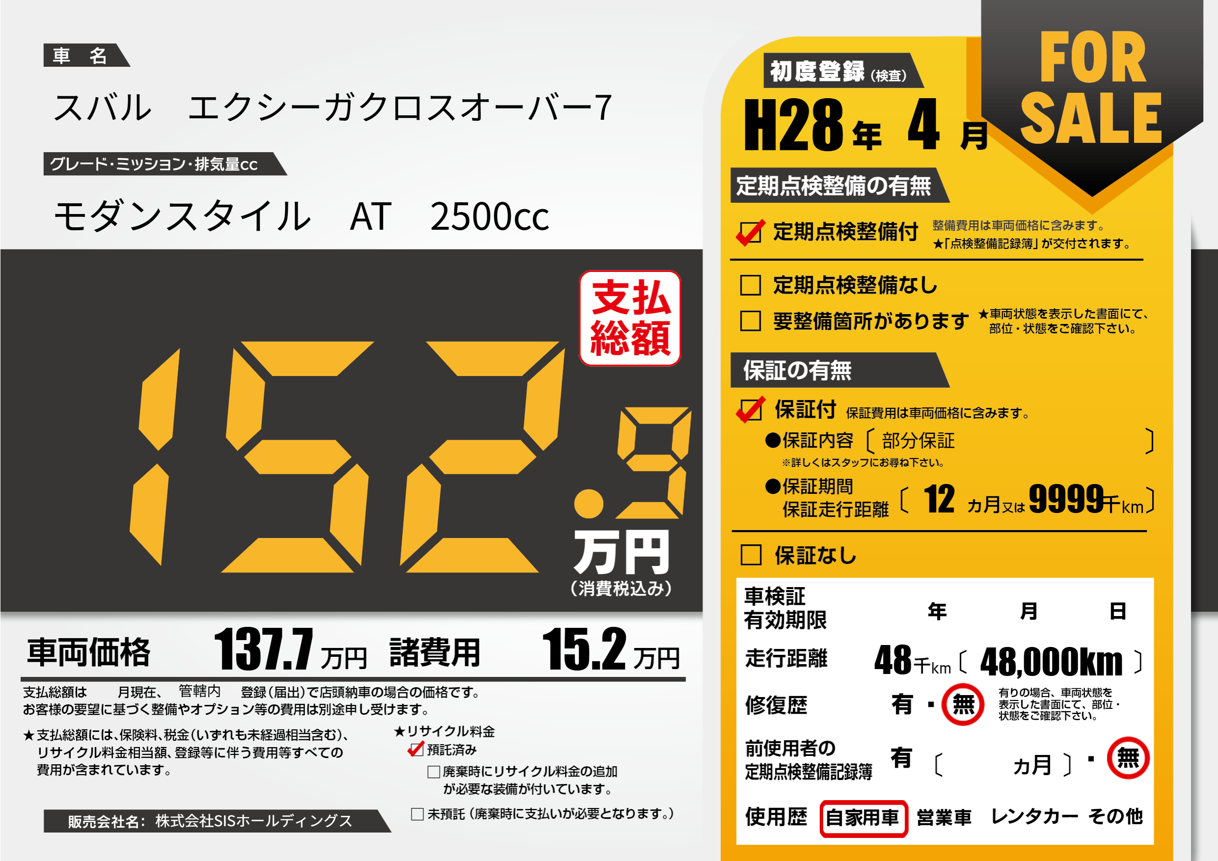 | 走行キロ | 4.8万km | 初年度登録 | H28年4月 |